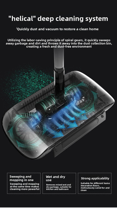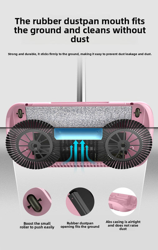 Experience a new way to maintain your floors with this ergonomic Manual Push Sweeper. The device utilizes a mechanical gear system that spins the brushes rapidly as you push it forward, creating a powerful sweeping action without a motor. The integrated microfiber mop pad at the rear ensures that fine dust particles missed by the brushes are wiped away, leaving your floors polished and clean.