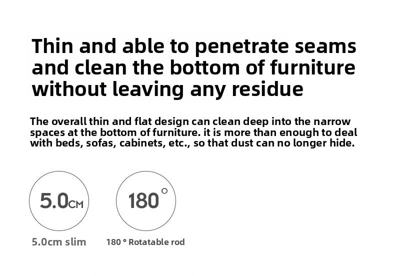 - Slim and Flexible Design: The cleaning head is approximately 5cm tall with a 180-degree rotating pole, allowing you to easily reach under sofas, beds, and cabinets.
