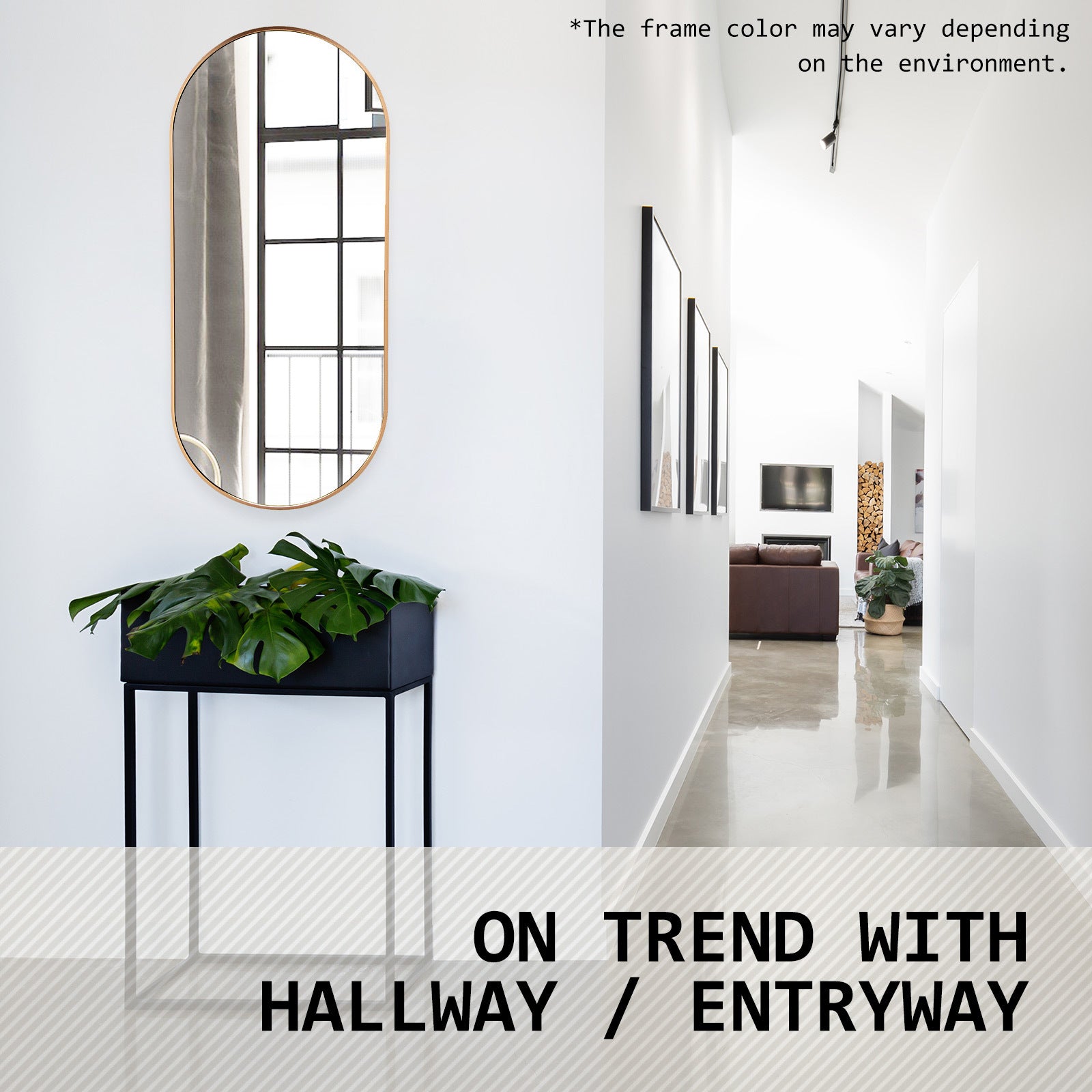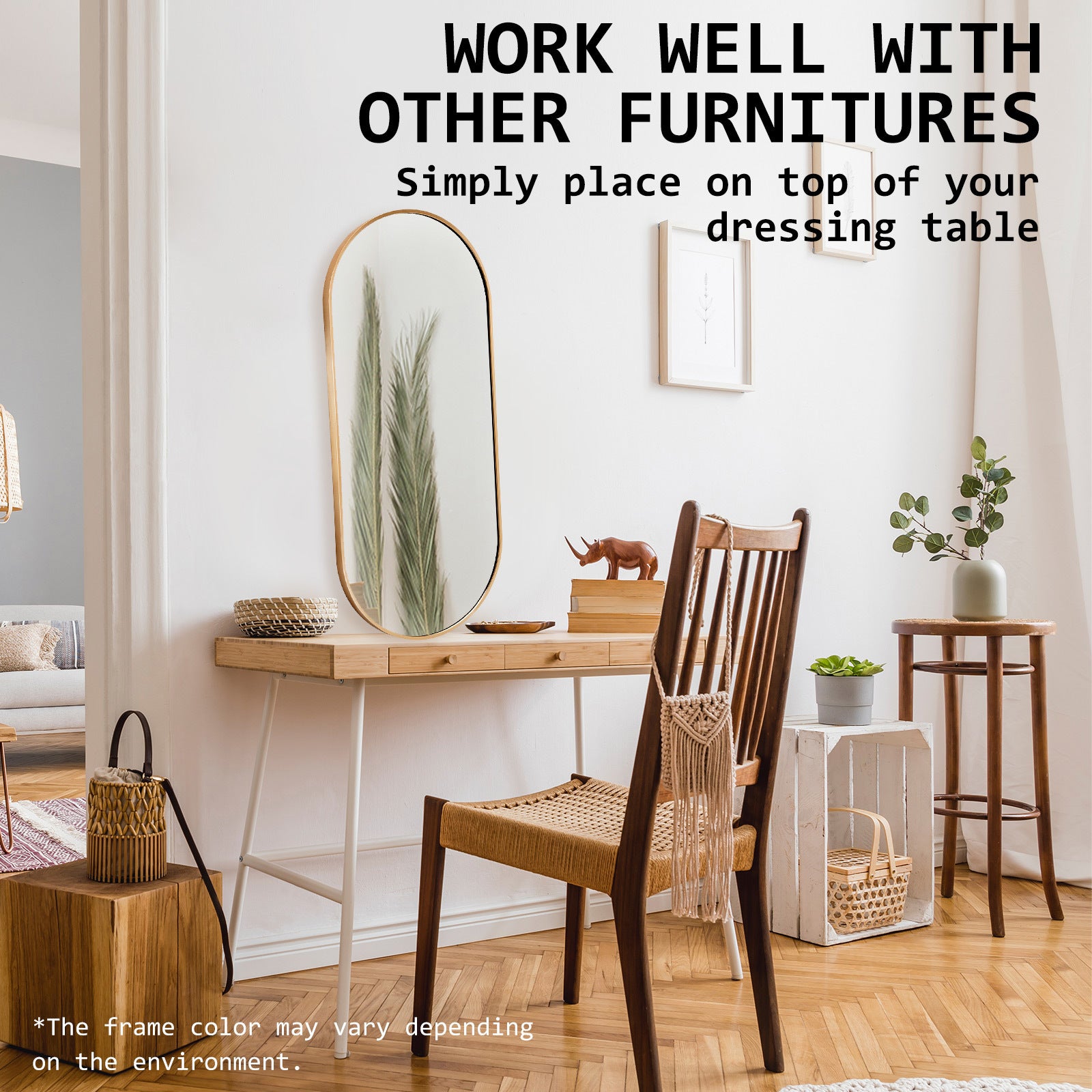 Please note it's neither brass gold nor rose gold. Our aluminum mirror, part of the gold color theme, has a unique shade within the gold spectrum. The frame color may vary with light due to aluminum's reflective nature.
