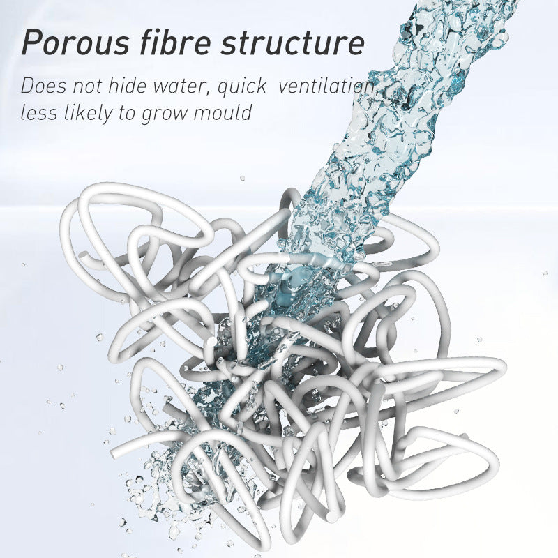 - Porous Structure: The porous fiber structure prevents water retention and allows for quick ventilation, which makes it less likely to grow mould.