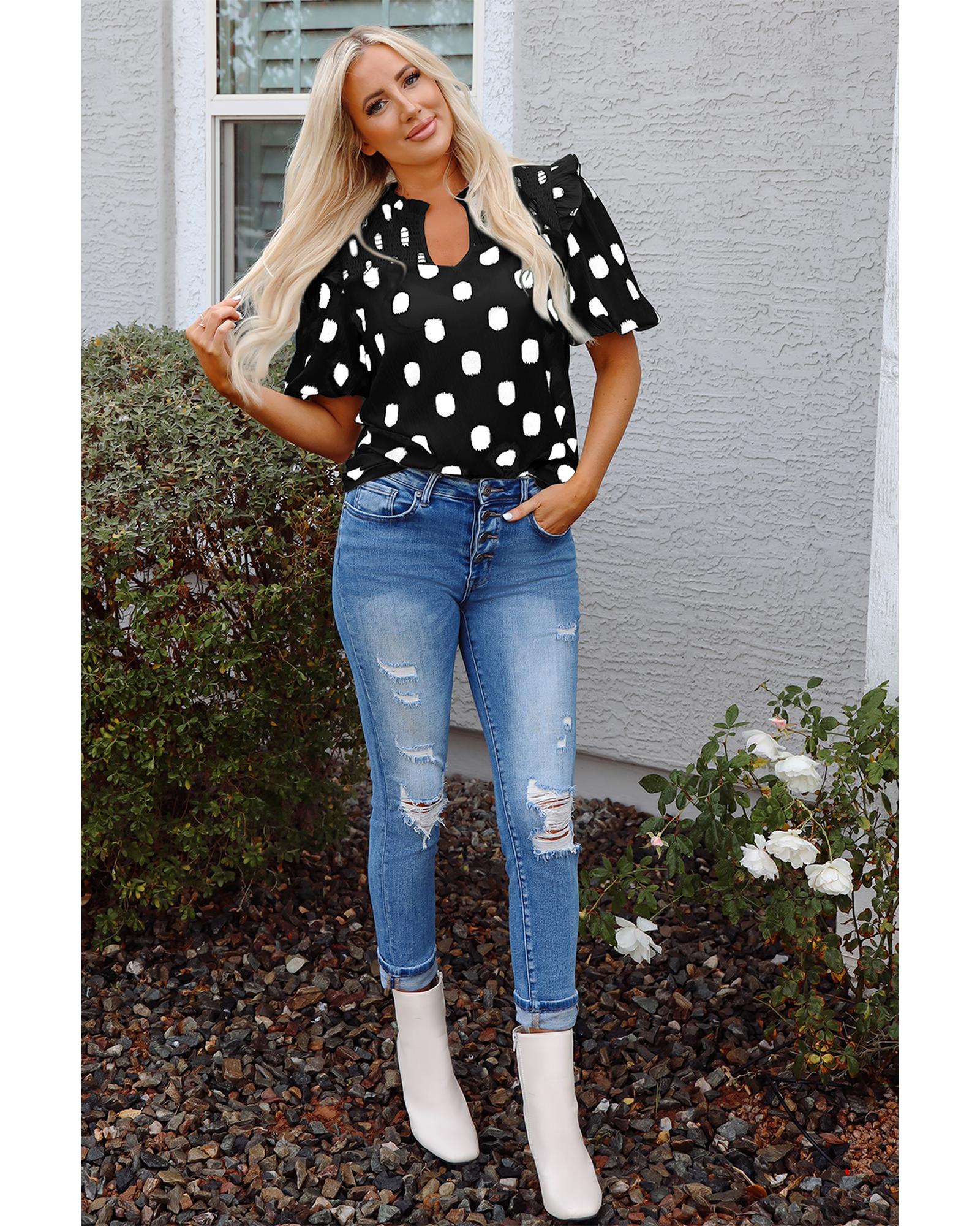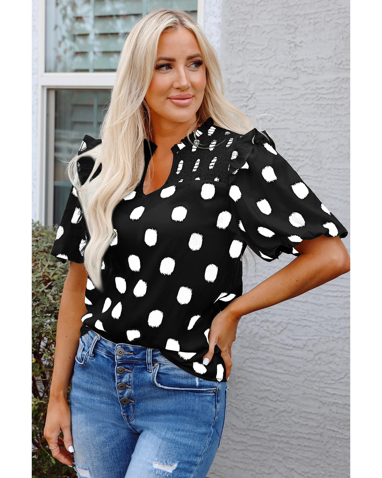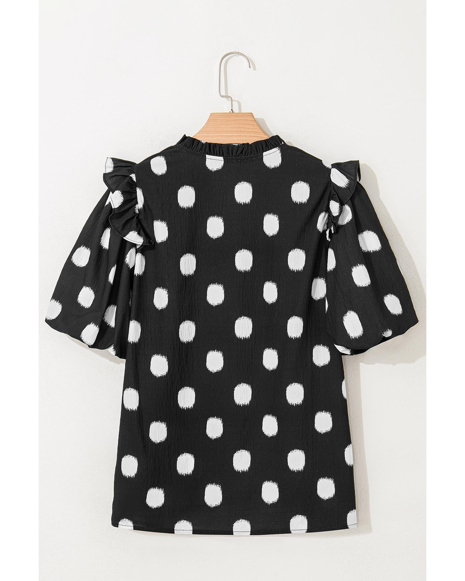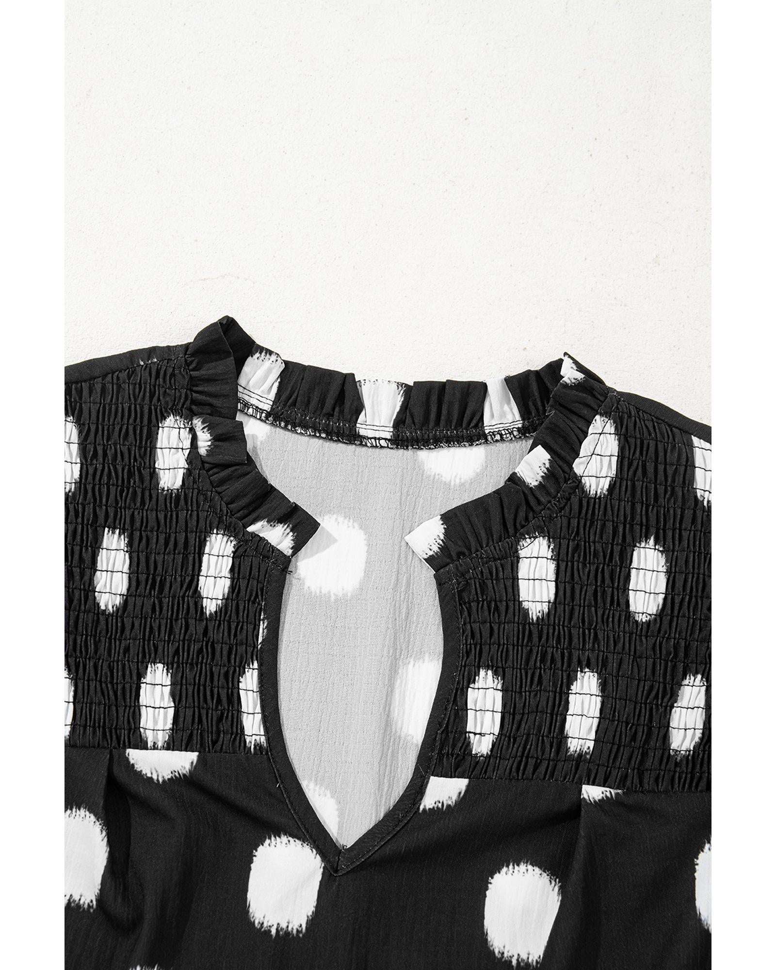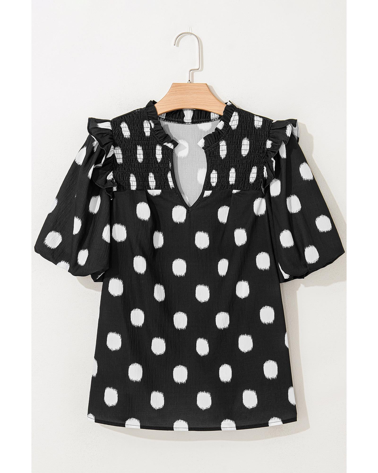 Black Polka Dot Print Shirred Yoke Notched Neck Balloon Sleeve Blouse - S