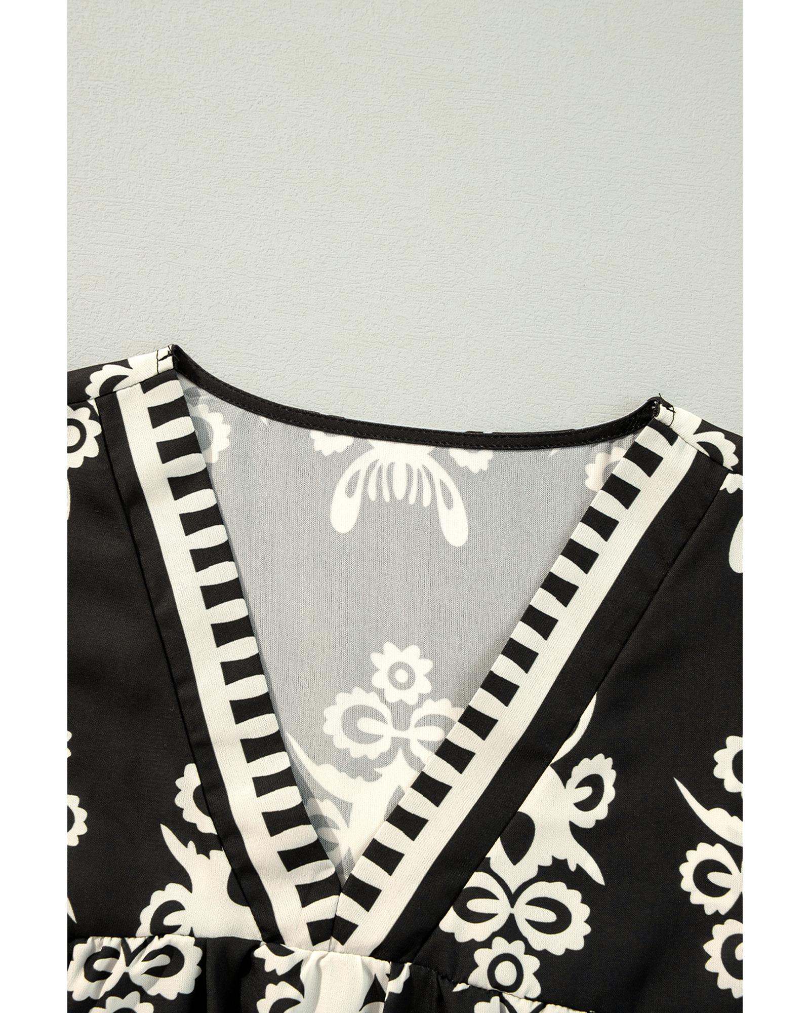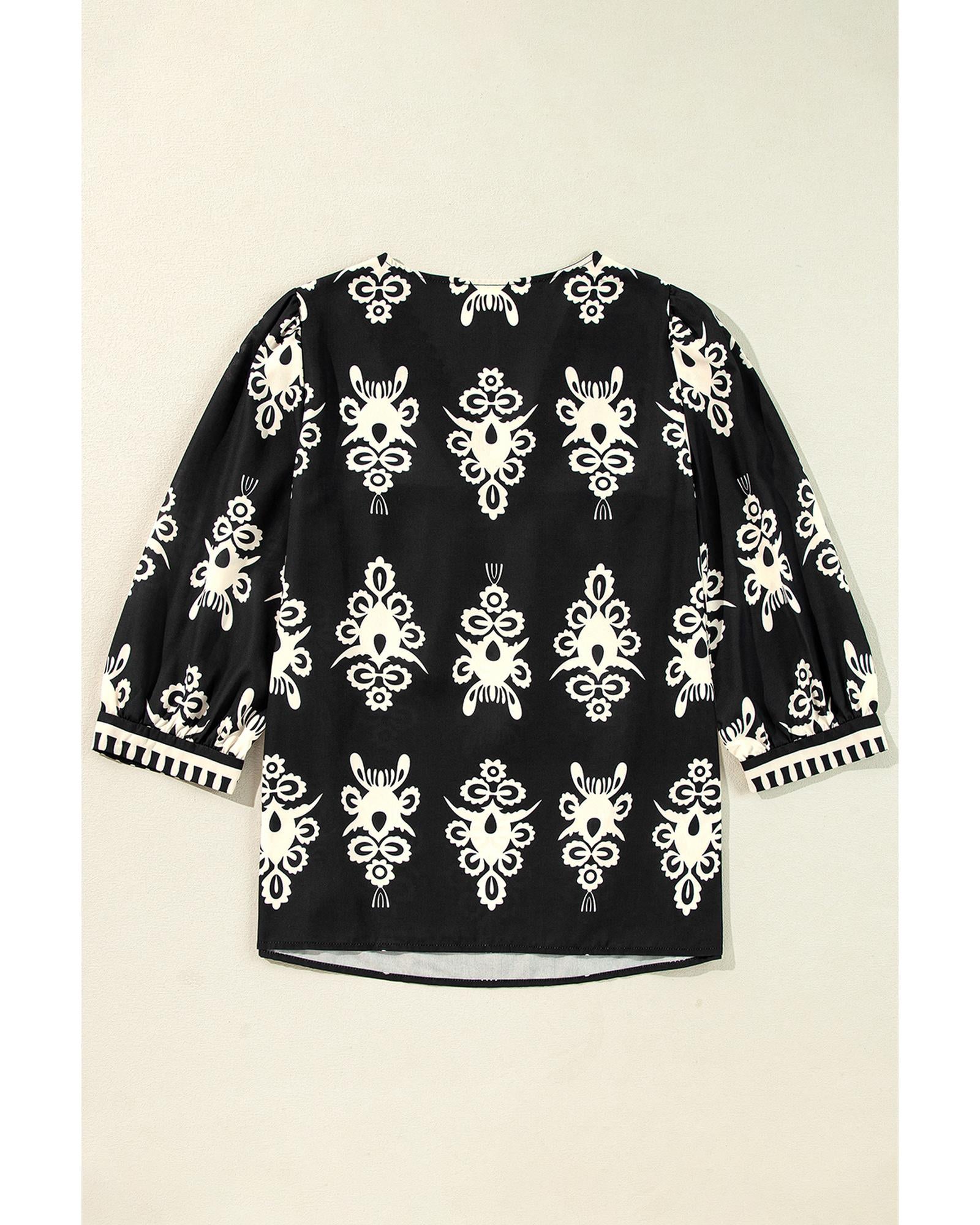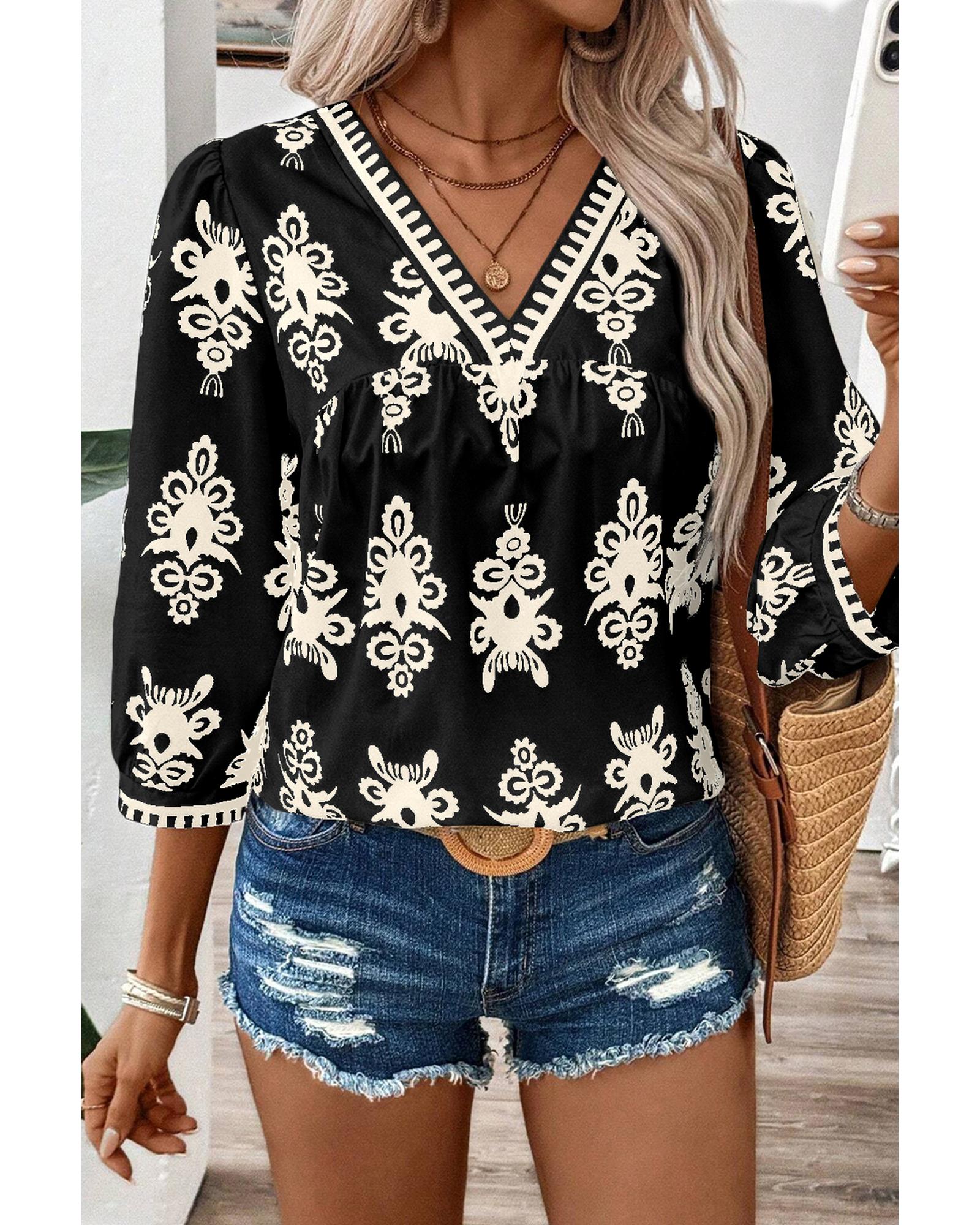 Black Vintage Geometric Printed 3/4 Sleeve V Neck Blouse - S