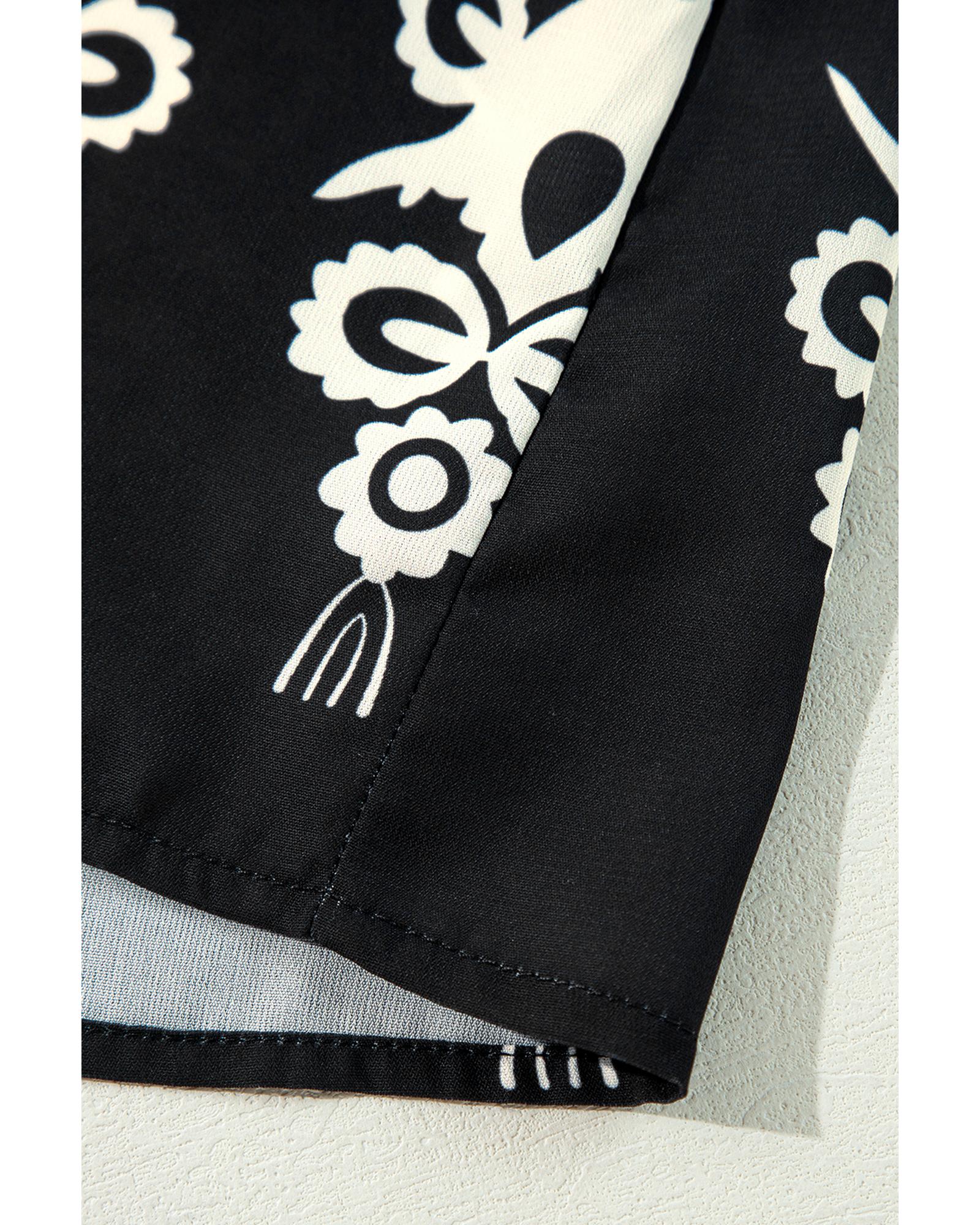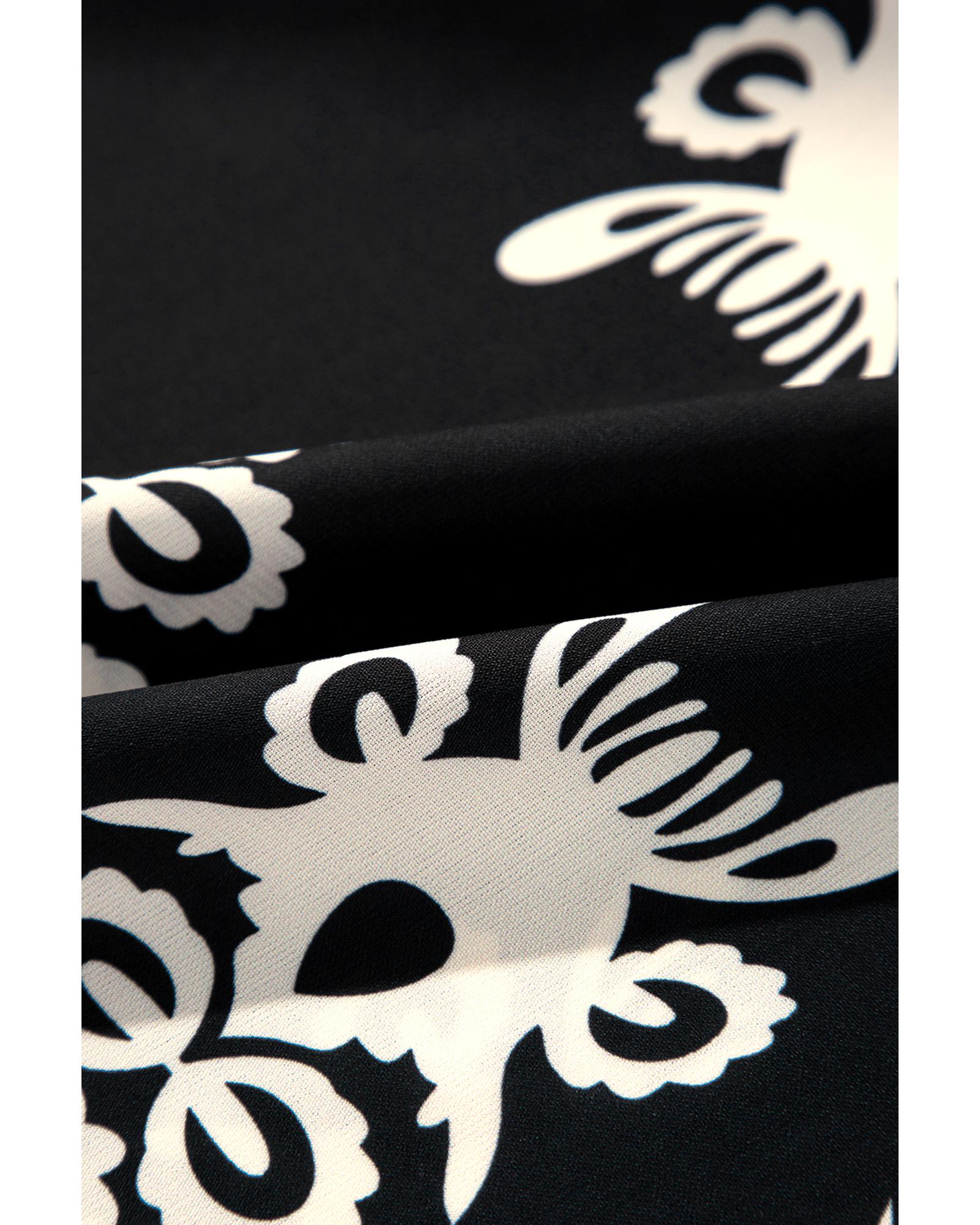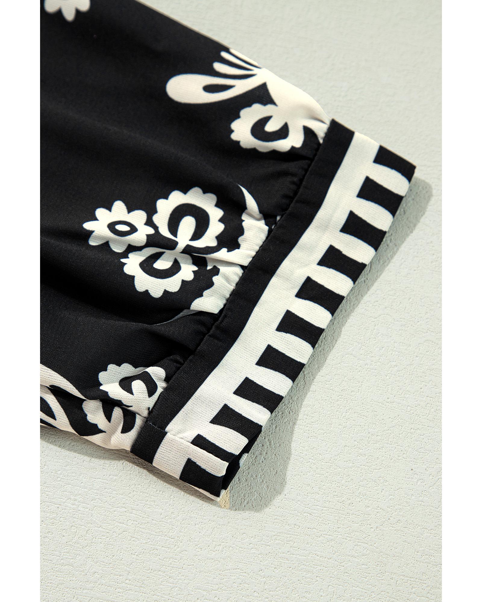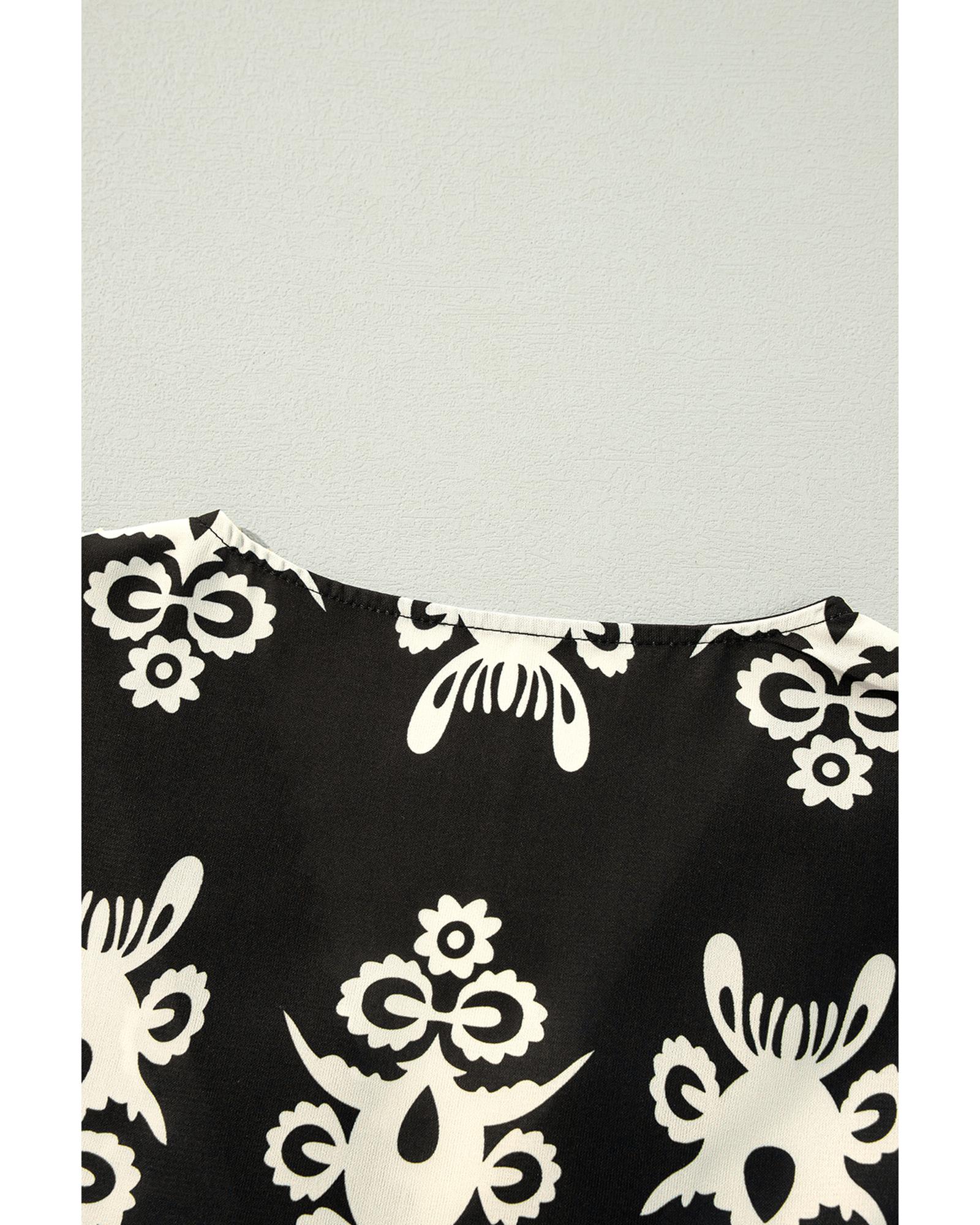 Black Vintage Geometric Printed 3/4 Sleeve V Neck Blouse - S