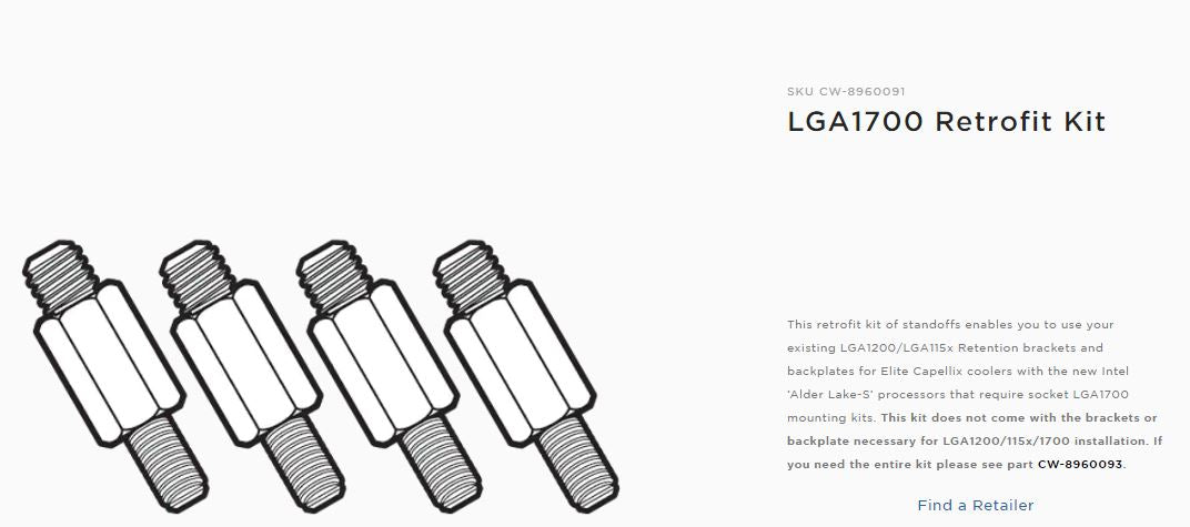 This retrofit kit of standoffs enables you to use your existing LGA1200/LGA115x Retention brackets and backplates for Elite Capellix coolers with the new Intel ‘Alder Lake-S’ processors that require socket LGA1700 mounting kits. This kit does not come with the brackets or backplate necessary for LGA1200/115x/1700 installation.