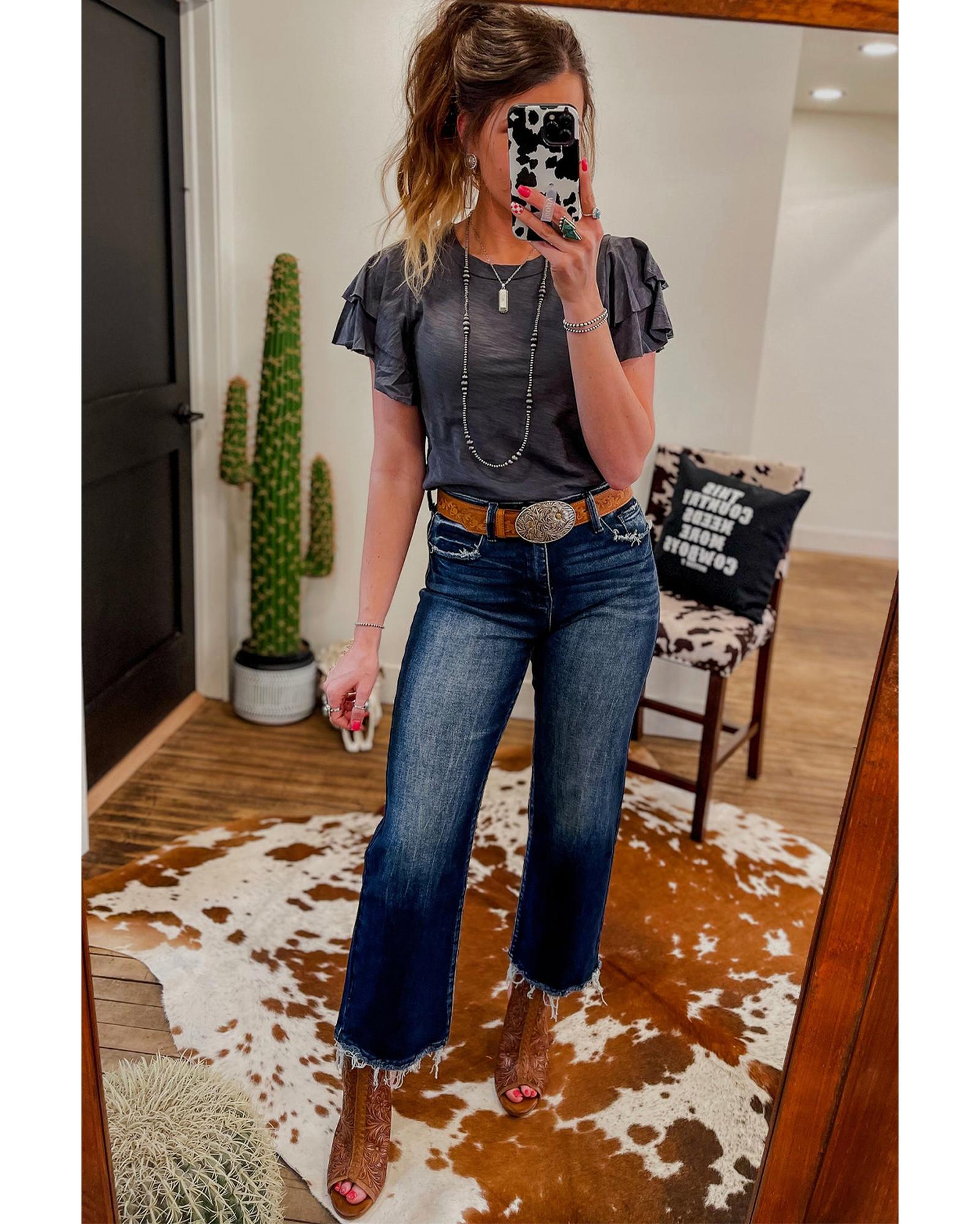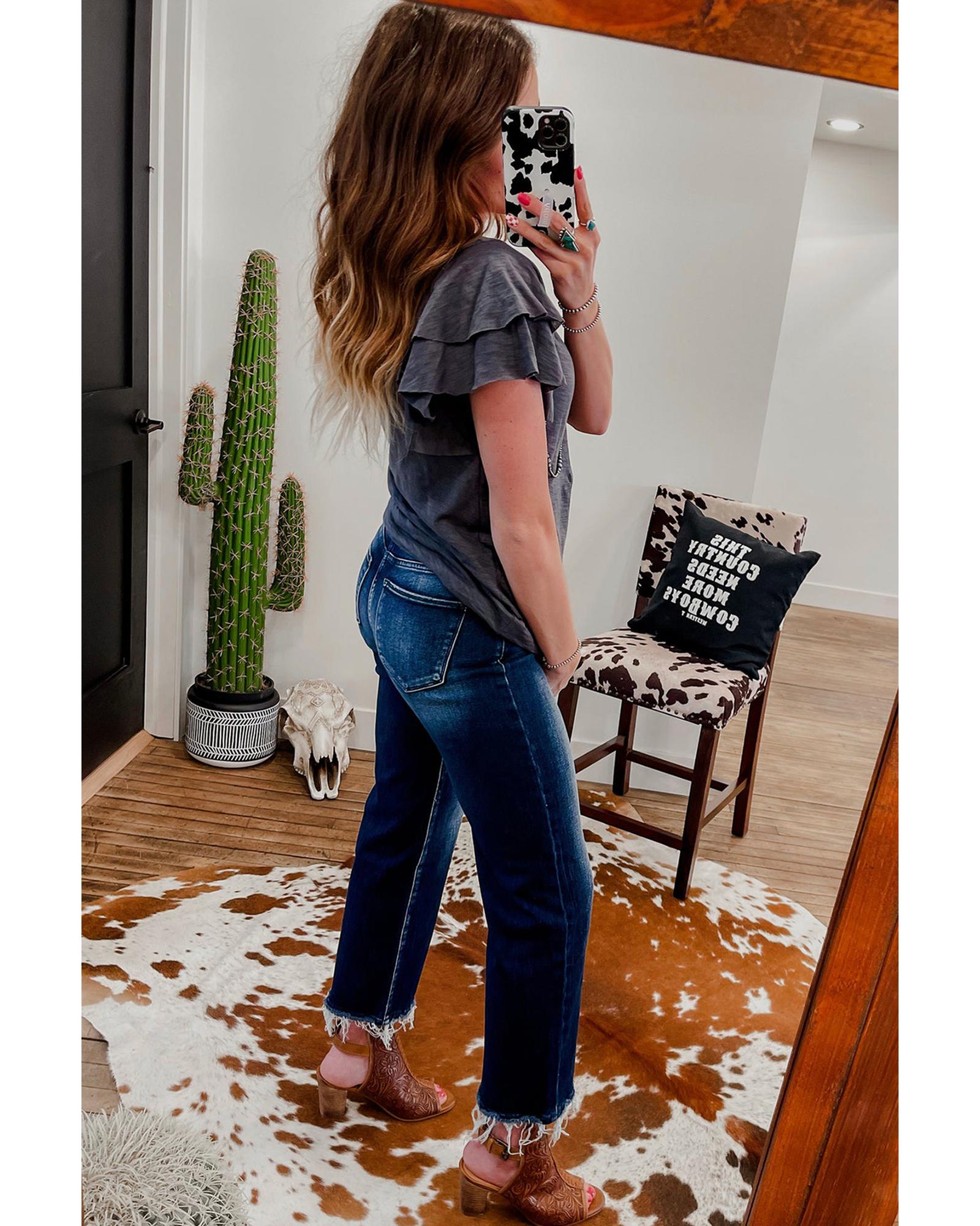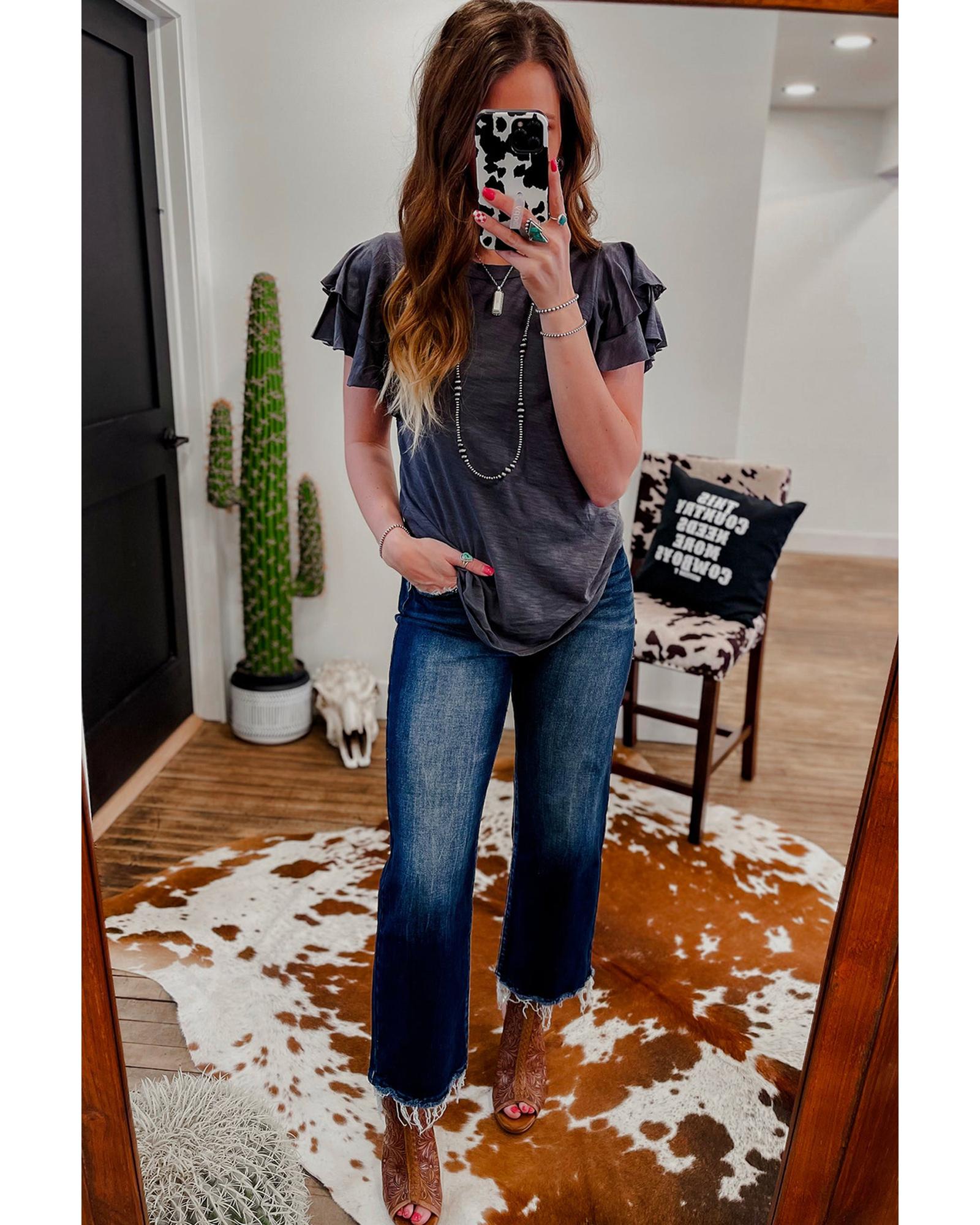 Dark Grey Layered Ruffle Short Sleeve Round Neck Top - M