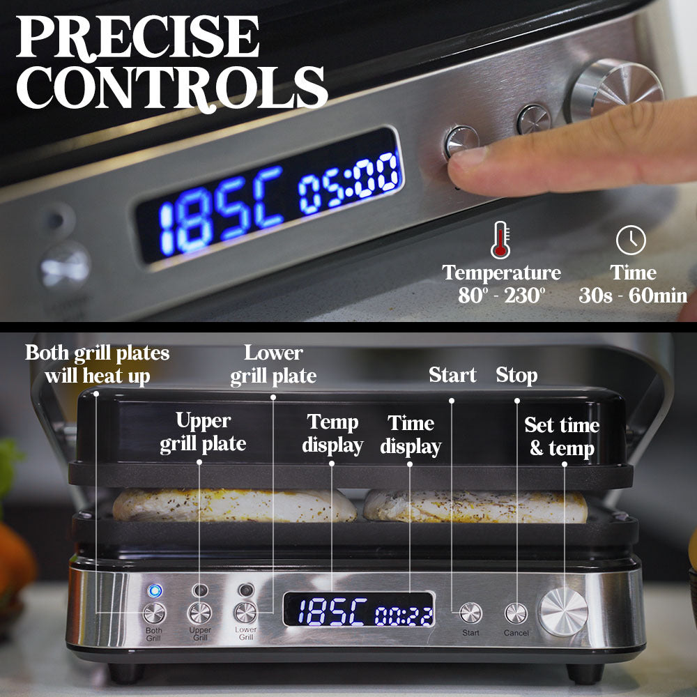The easy to use control panel allows you to set the temperature for perfect cooking control and it will indicate when it is ready. Each plate of this powerful appliance quickly heats up to 230℃ so you can sizzle a succulent steak in no time. Thanks to the timer function you don't have to worry about getting distracted and ending up with overcooked meals.