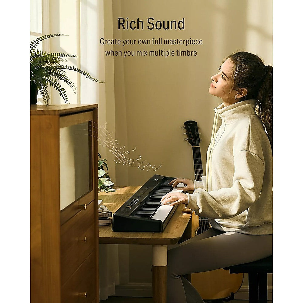 Weighing just 3.5kg and folding down to 63cm, this ultra-portable digital piano is designed for easy transportwhether you're traveling by air, storing it at home, or taking it to practice anywhere. Featuring 88 full-size keys, it offers an authentic piano feel with intelligent strength sensing that adjusts volume based on touch, delivering a dynamic and expressive playing experience.