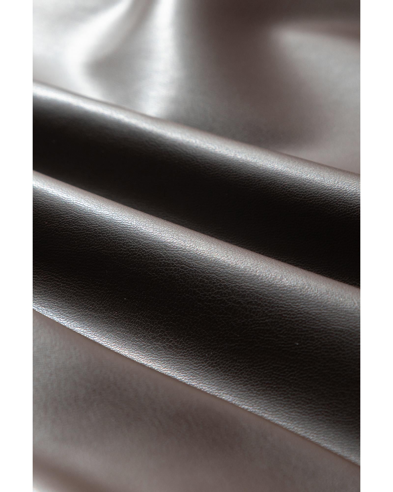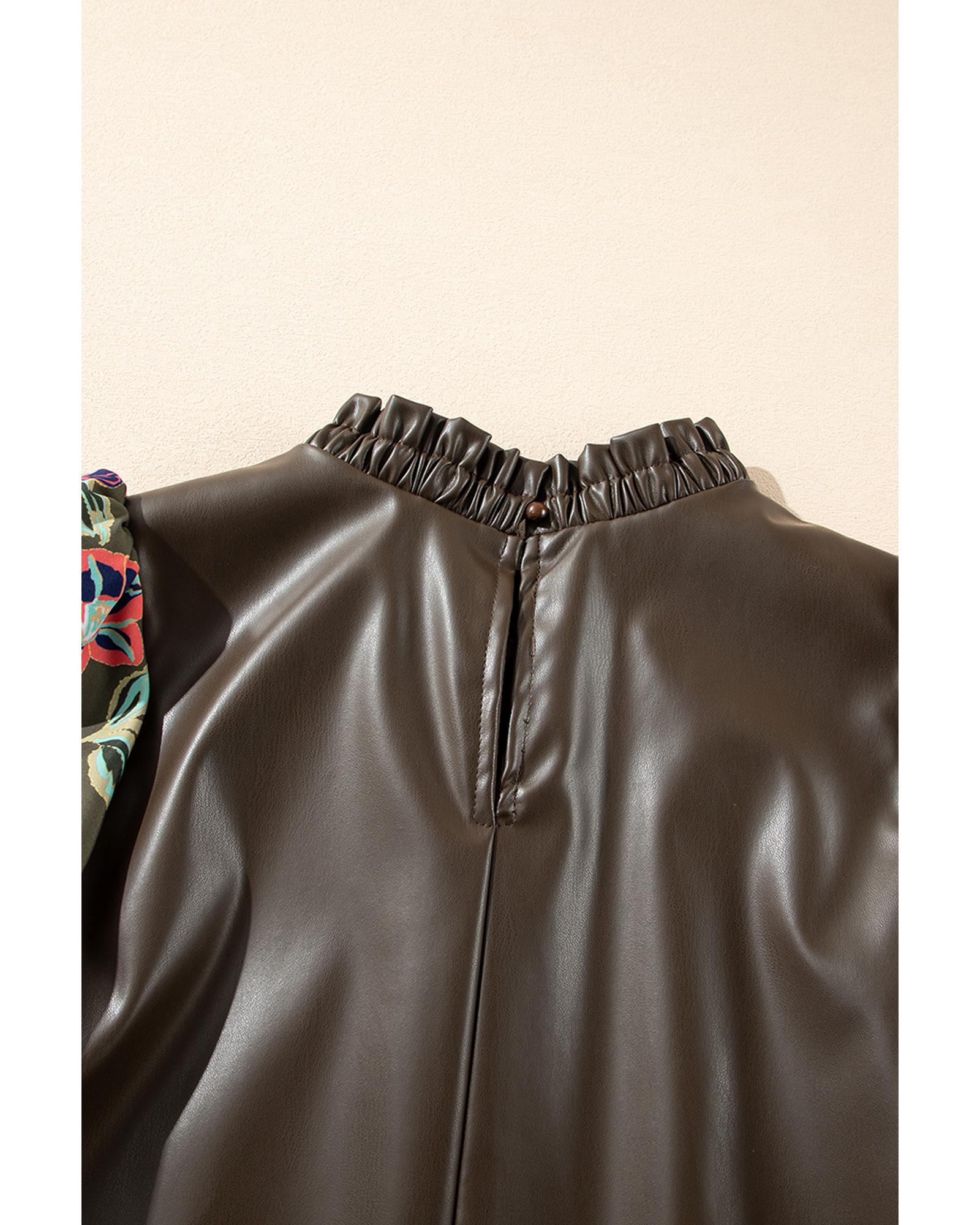 Four Leaf Clover Floral Bubble Sleeve Patchwork Leatherette Frilled Round Neck Blouse - S