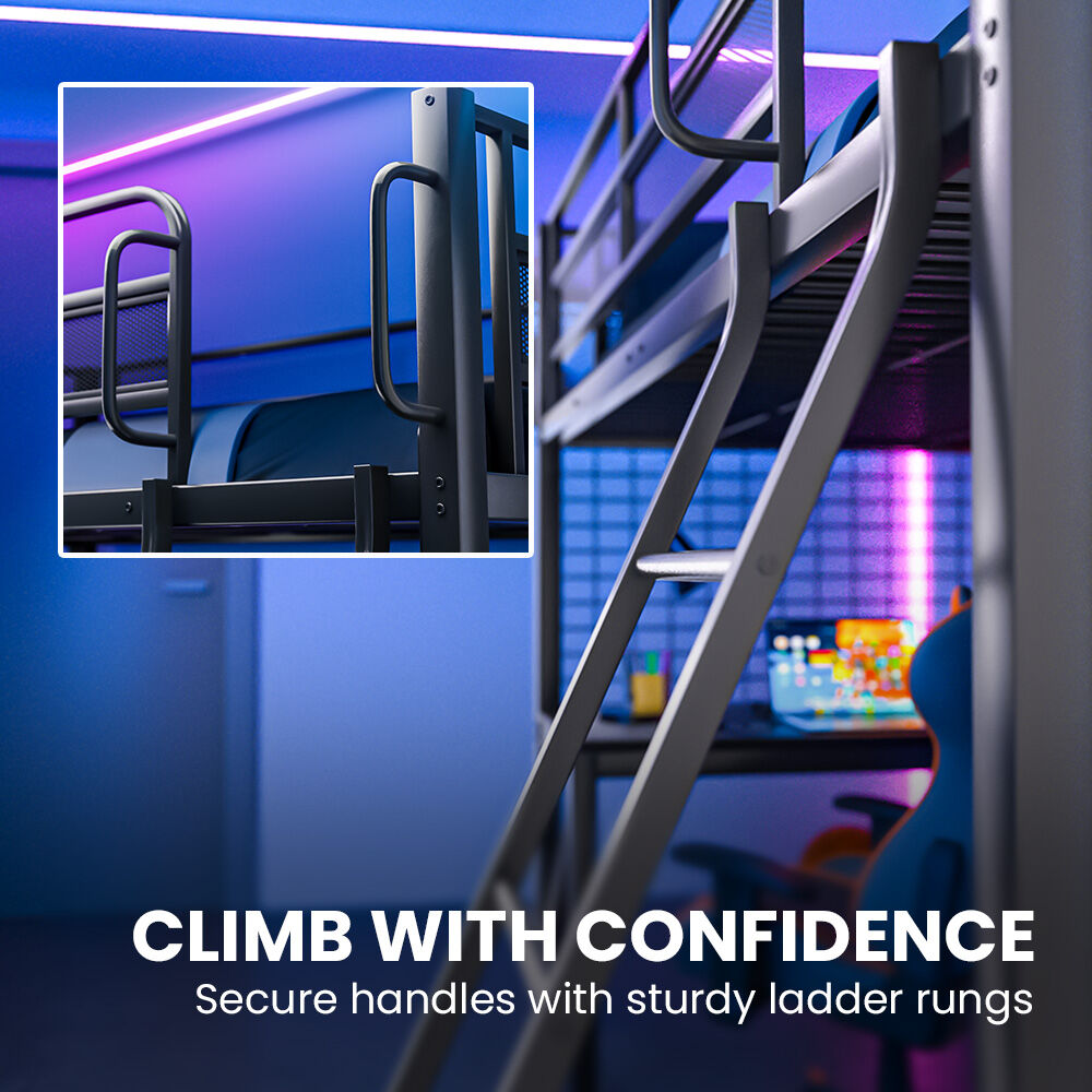 Underneath, you've got a full-size desk and a cabinet ready to go. The clean, no-fuss design fits right in - whether your walls are covered in posters, LEDs, or both. A solid, fixed ladder means no shaky midnight climbs when you're rushing back from a respawn.