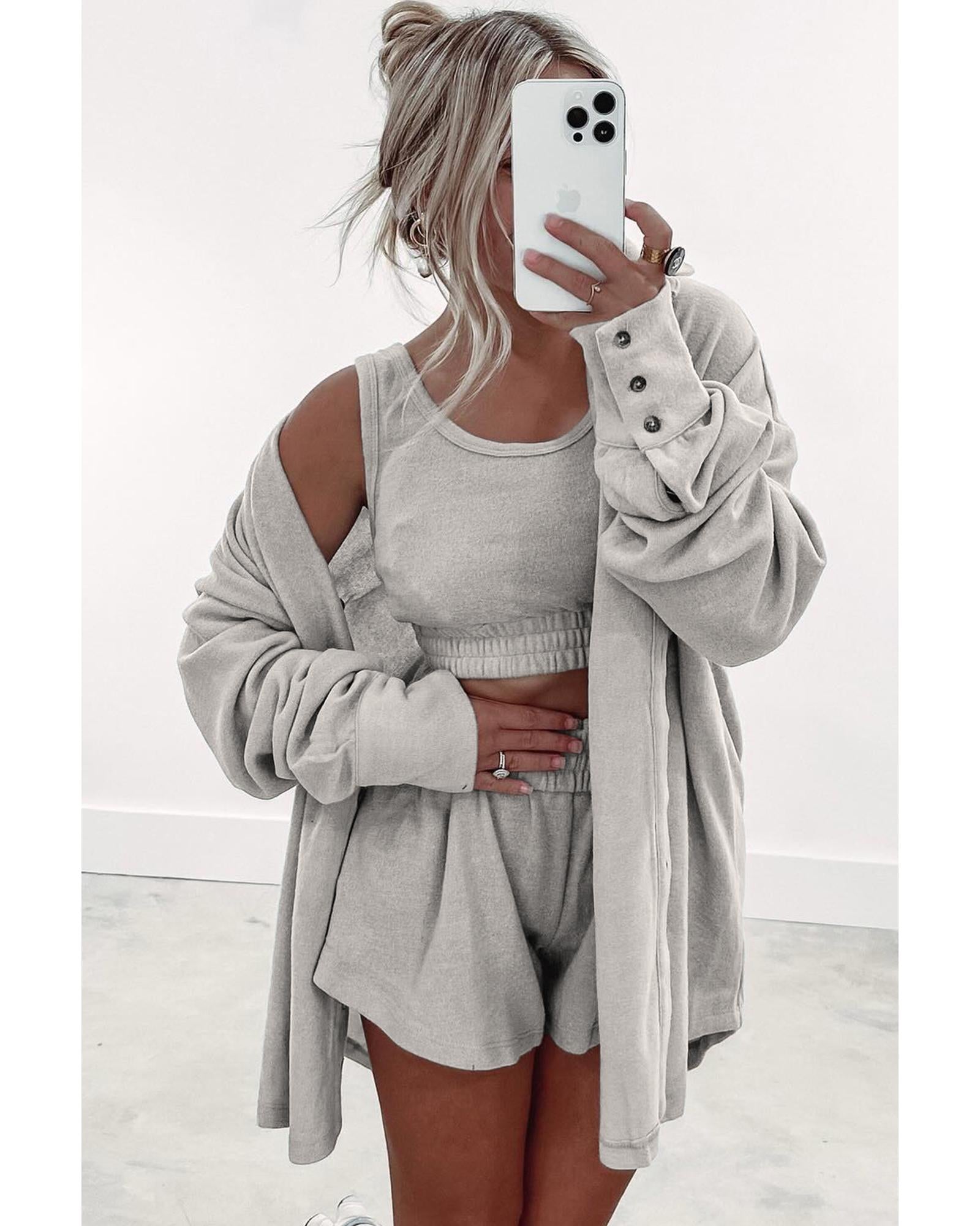 Gray 3 Pcs Crop Tank Top Shorts with Cardigan Lounge Set - M
