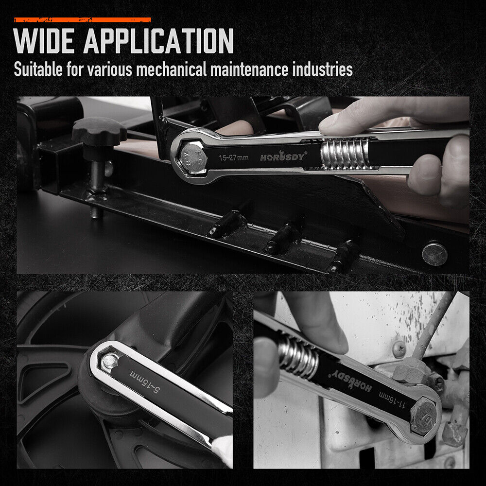 Different sizes meet your different needs. The 8-inch universal wrench fits both standard 3/16 '' to 5/8 '' and metric 5mm to 16mm nuts and bolts; 10-inch universal wrench fits both standard 11/16 '' to 1-1/16 '' and metric 17mm to 27mm nuts and bolts, adjust the size by moving the middle push block.