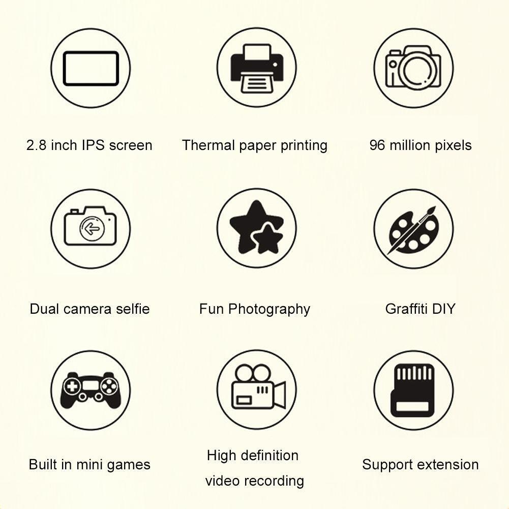 • Functions include taking photos (selfie, timing), printing, video recording, playback, games, and photo stickers