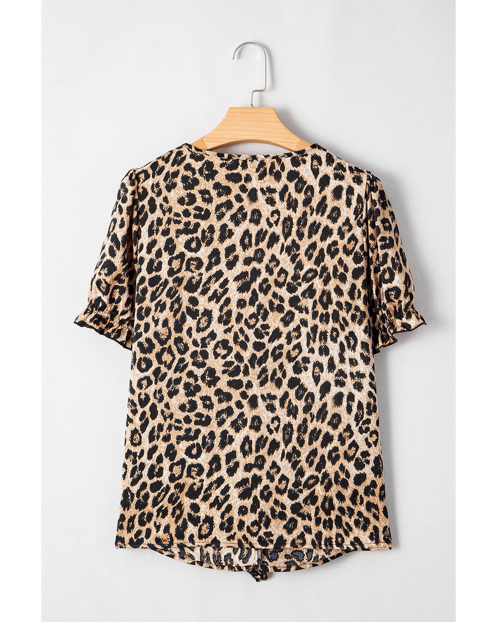 Khaki Leopard Ruffled Neck Cascading Puff Short Sleeve Top - M