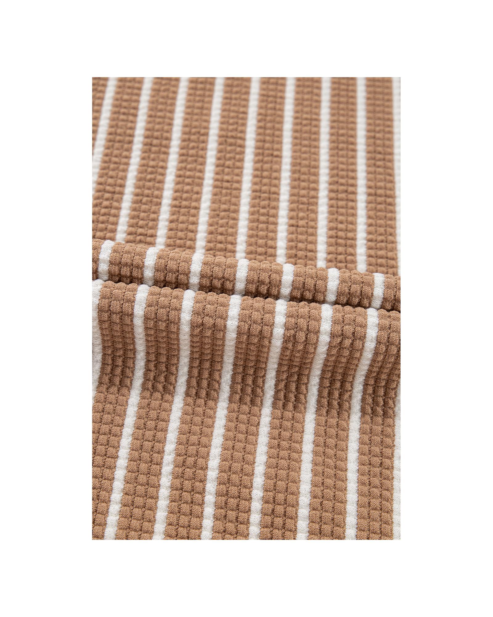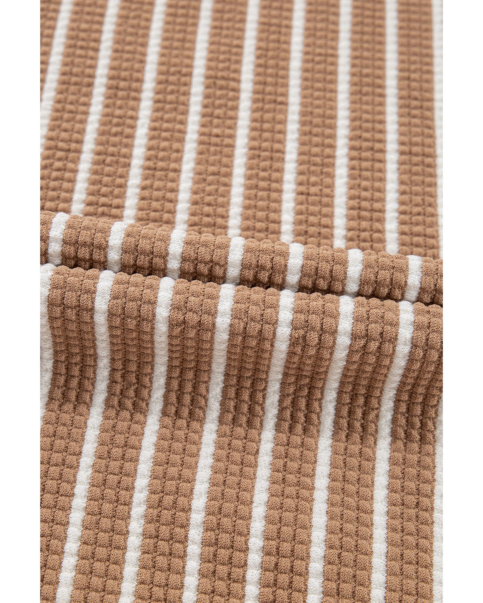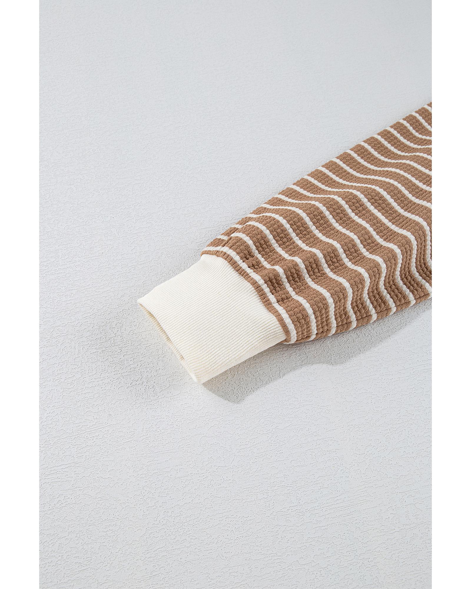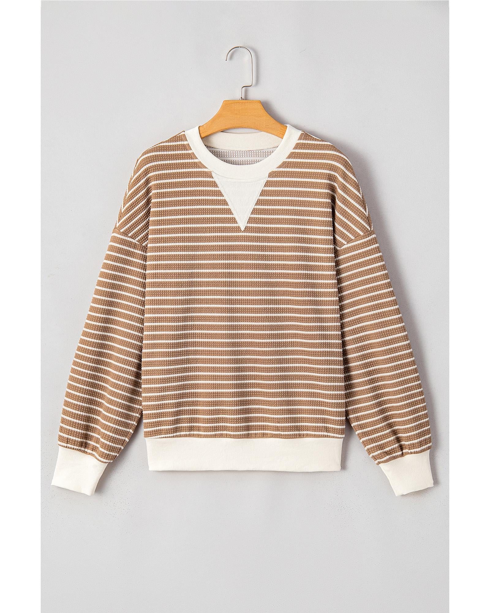 Khaki Stripe Patched Edge Textured Round Neck Long Sleeve Top - XL
