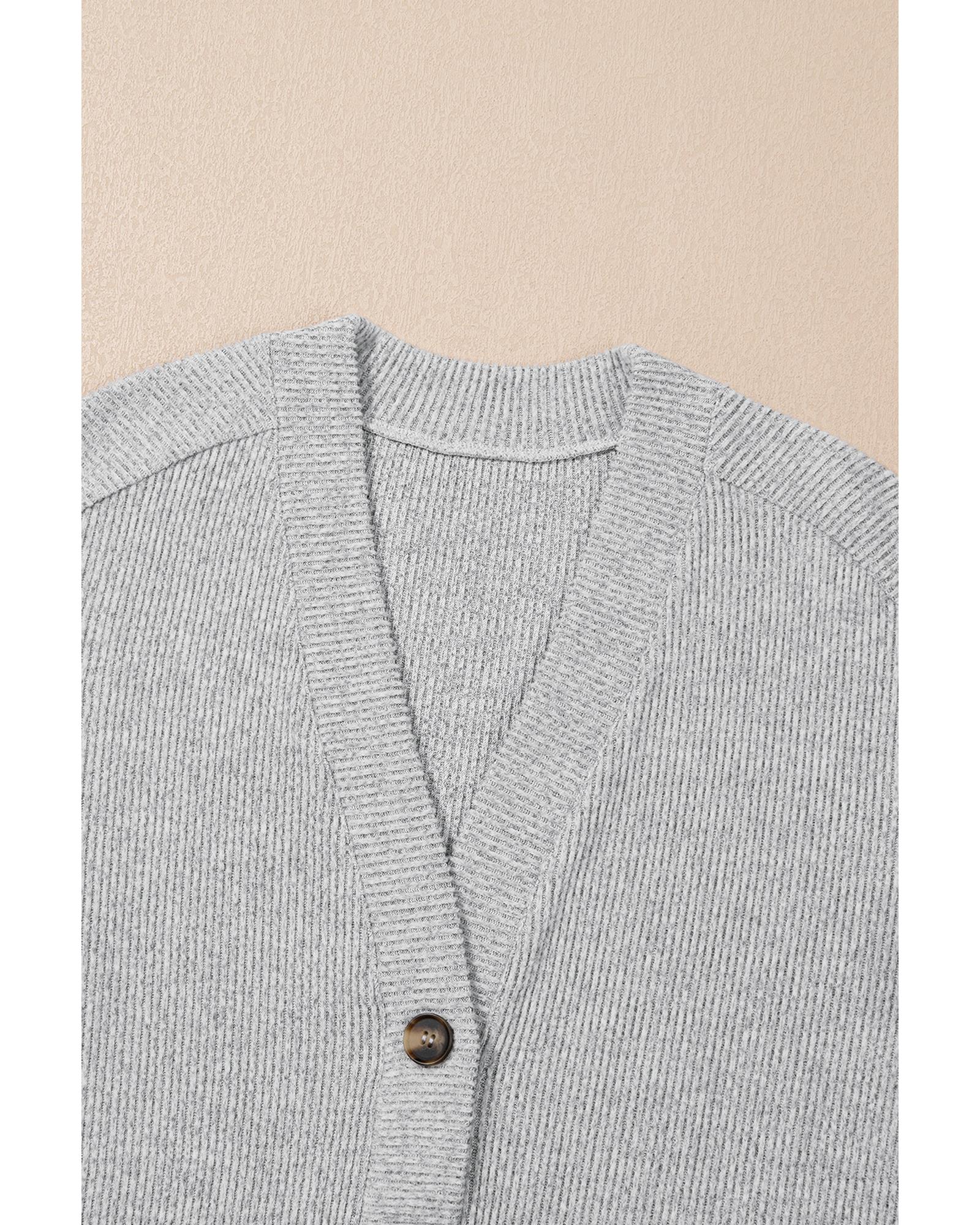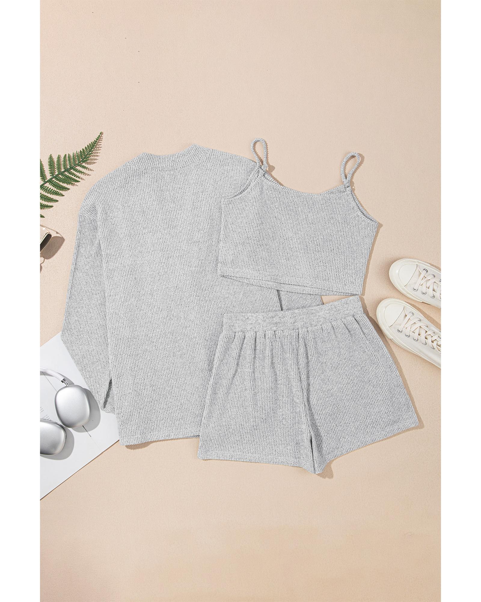 Light Grey 3 Pieces Rib Crop Camisole Matching Shorts Lounge Set with Cardigan - M