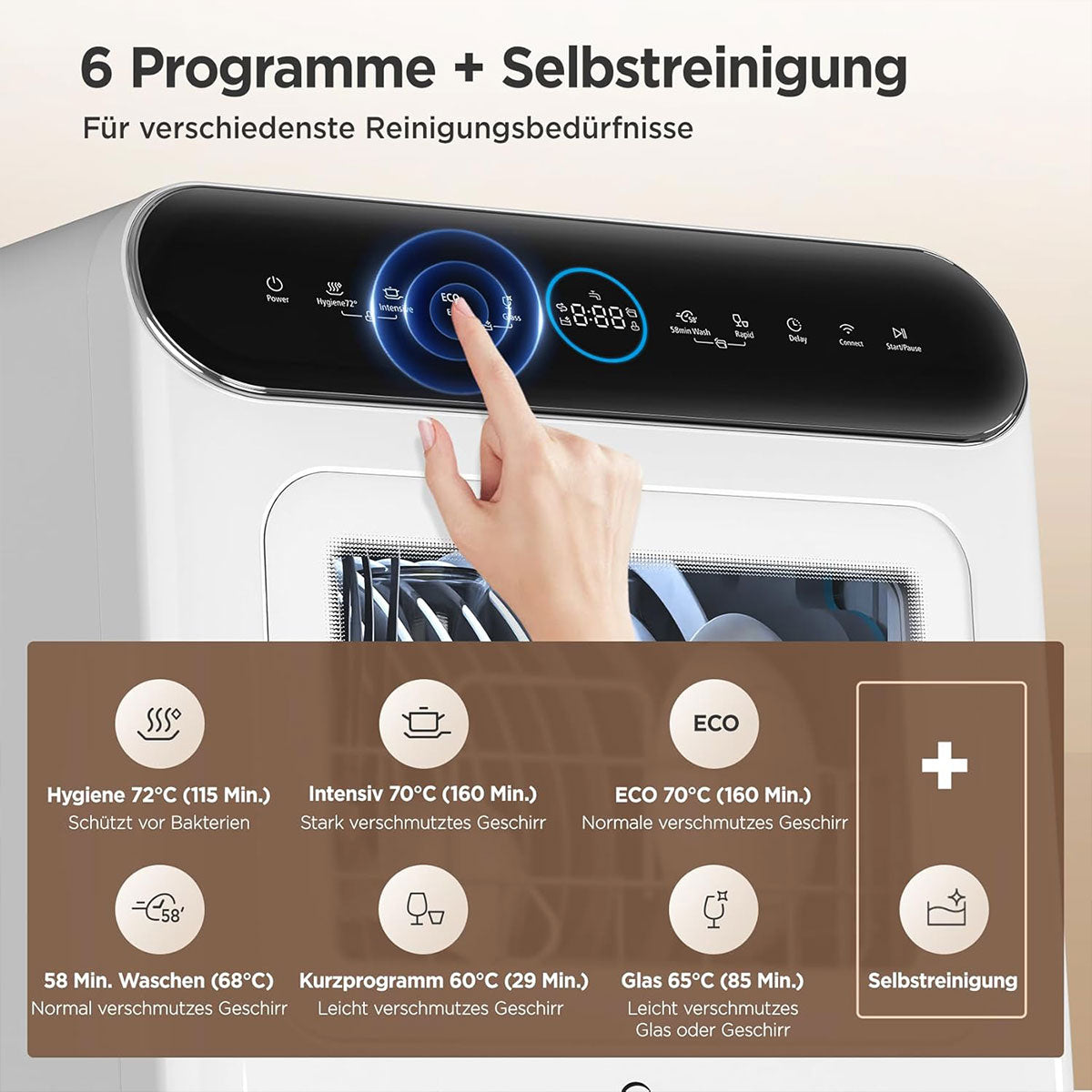 - Program: Hygiene72, Intensive, ECO, Glass, 58 min Wash, Rapid, self-cleaning