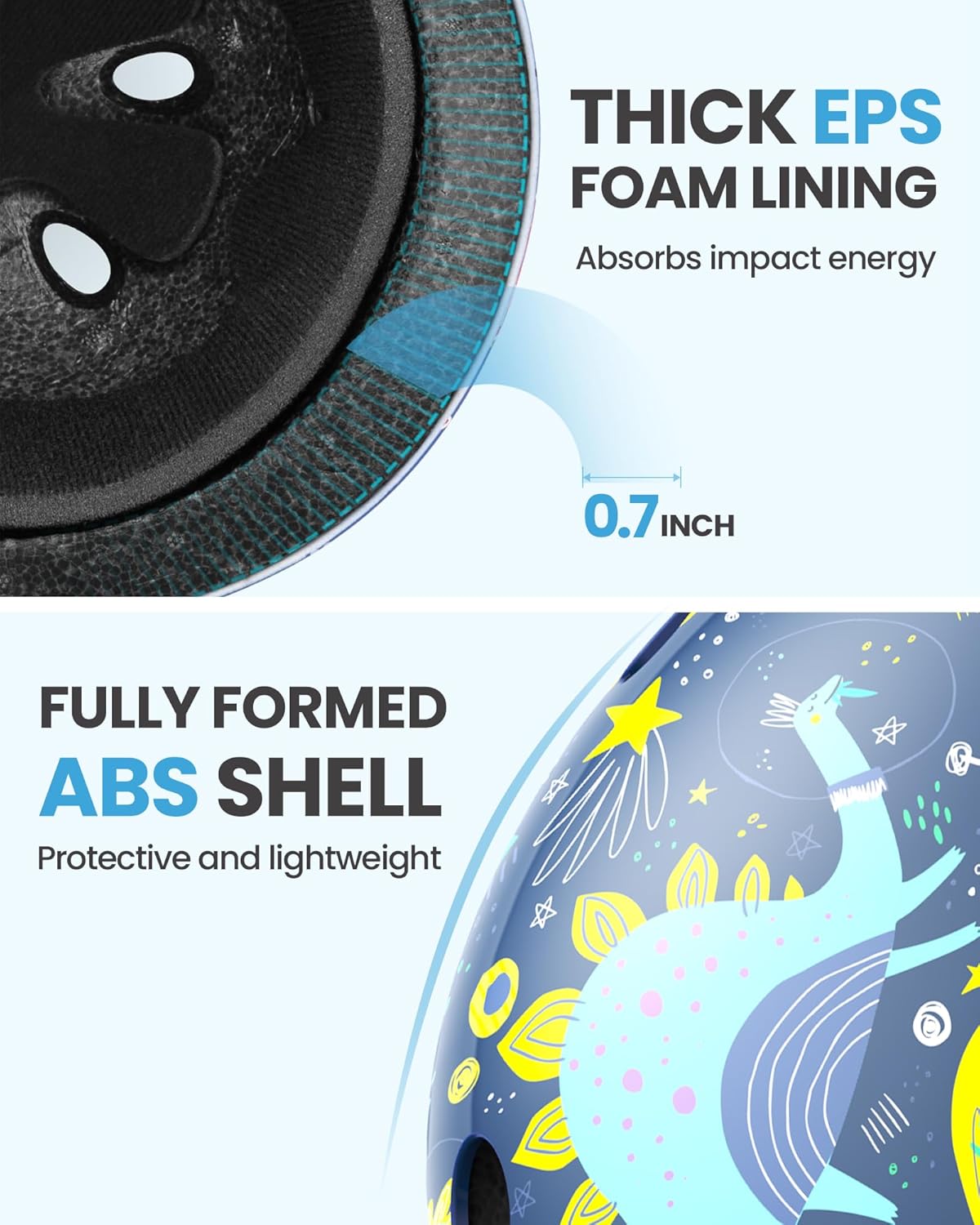 Protect kids with both comfort and impact resistance. REINFORCED ABS SHELL THICKENED SHOCK-ABSORBING EPS CORE provides solid protection when skateboarding, rollerblading, cycling and etc.