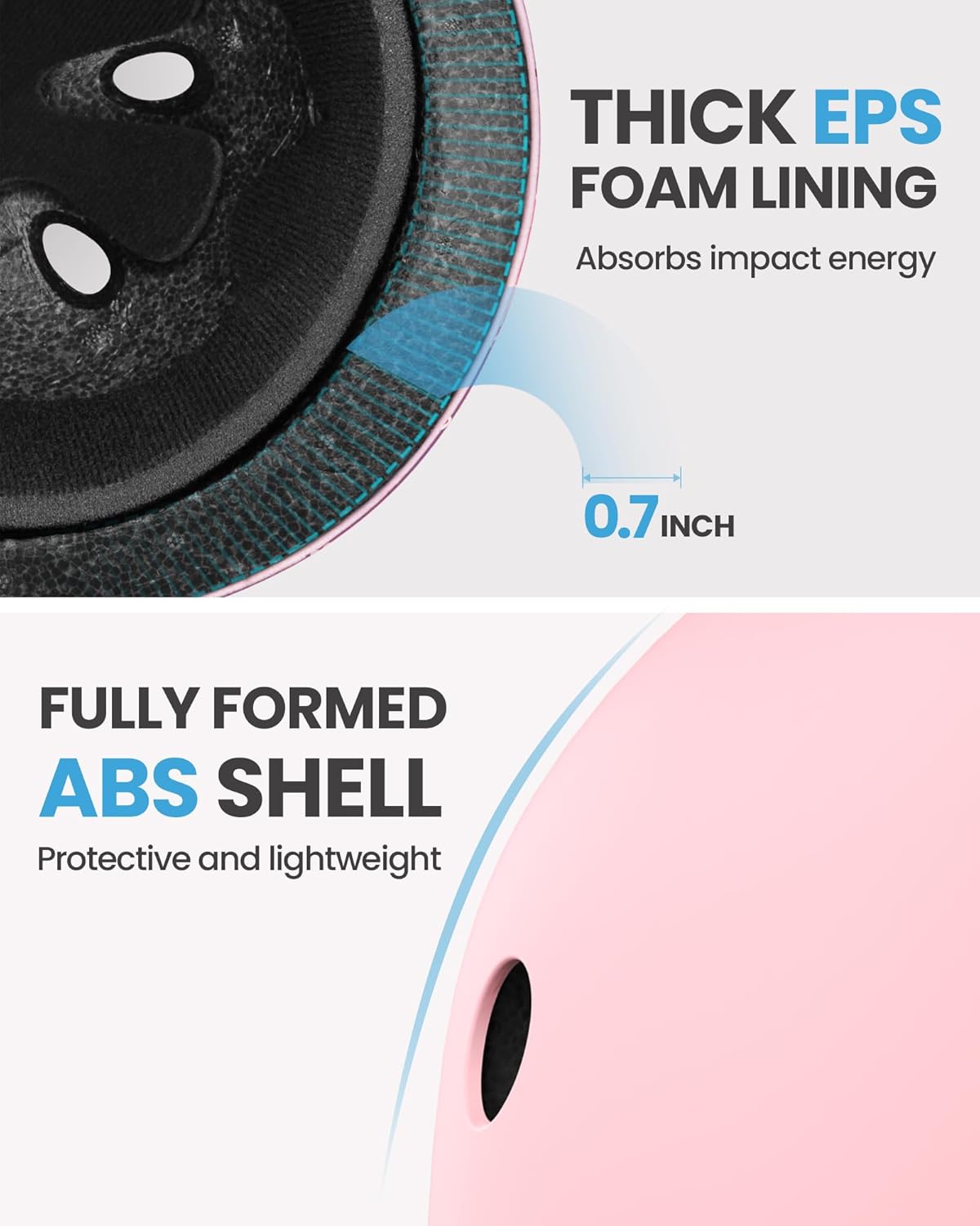 Protect kids with both comfort and impact resistance. REINFORCED ABS SHELL THICKENED SHOCK-ABSORBING EPS CORE provides solid protection when skateboarding, rollerblading, cycling and etc.