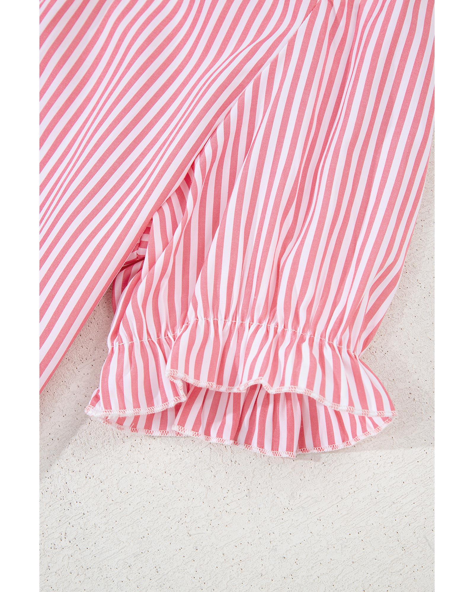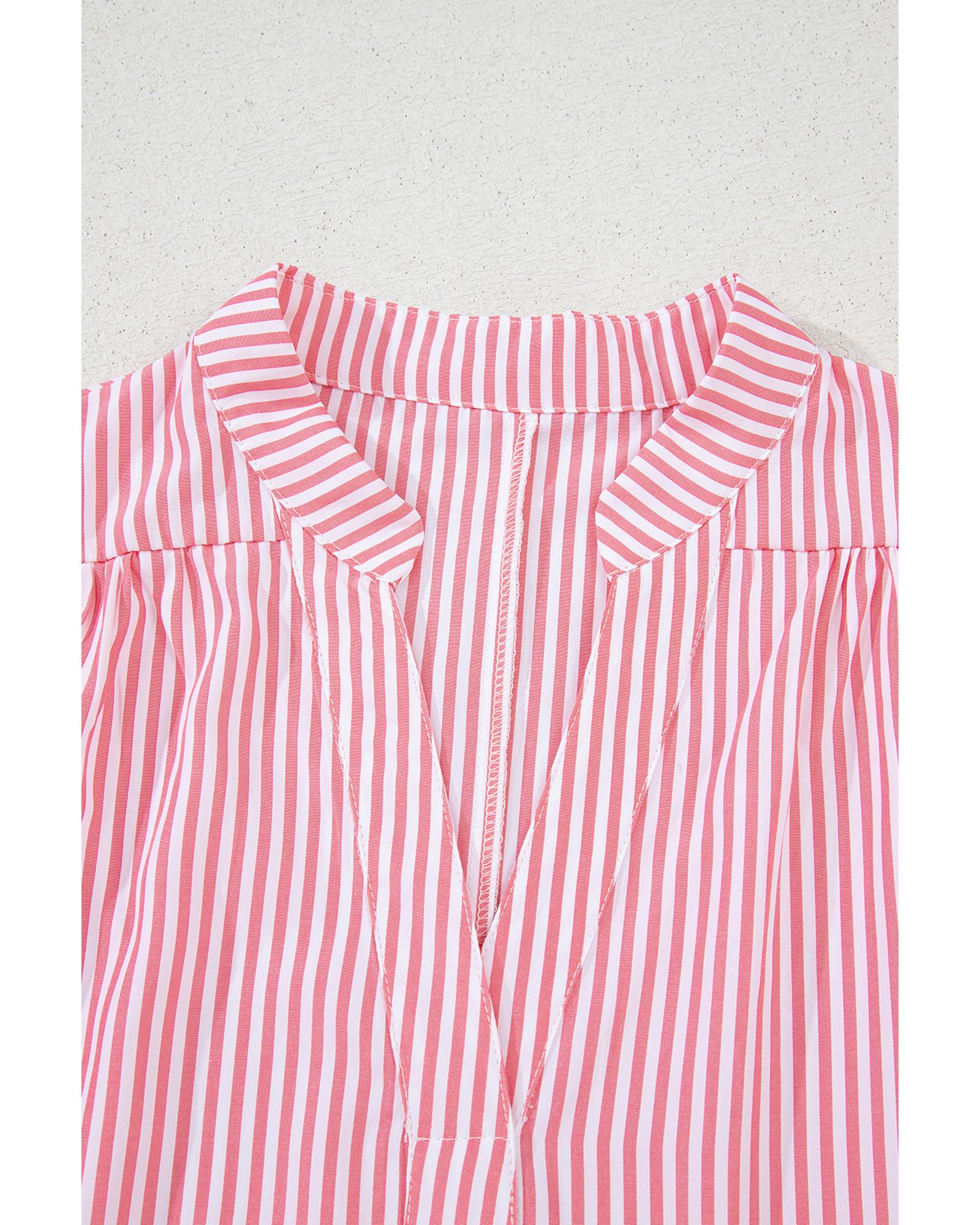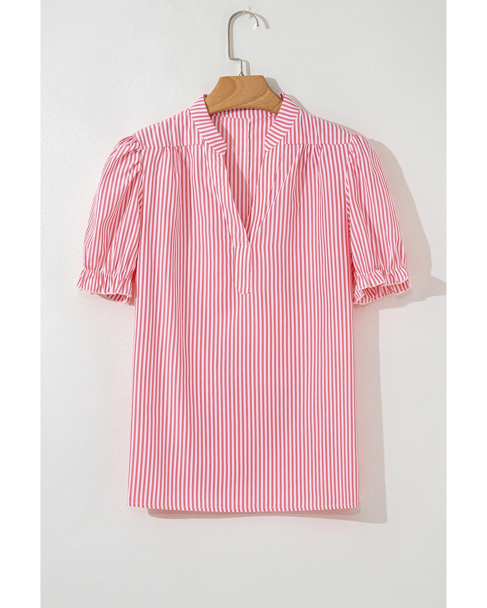 Pink Stripe Notched Neck Frilled Short Puff Sleeve Blouse - L