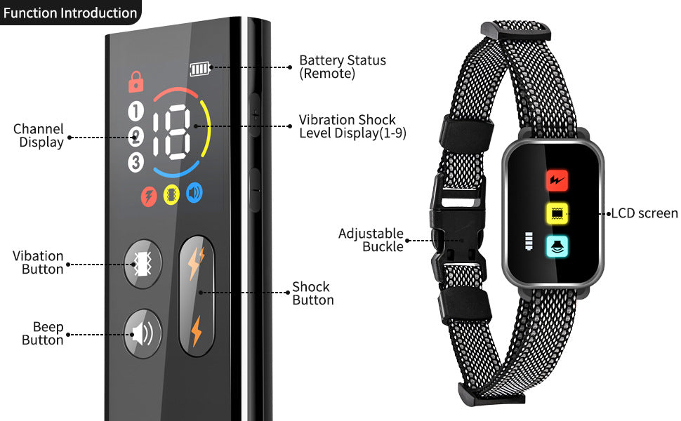 - Receiver Collar: LCD Screen, Adjustable Strap