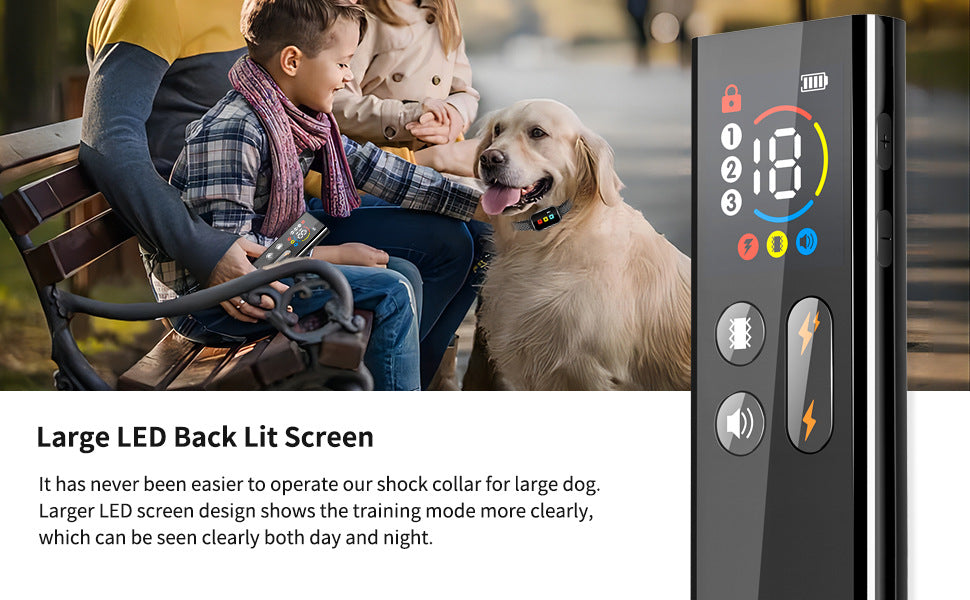 Build a better connection with your furry friend using this professional Dog Training Collar. Designed to help correct unwanted behaviors like barking, biting, and chewing, and to reinforce commands like 'sit', this system is an effective tool for dogs of all sizes (8-120lbs). It features three separate and humane training modes: beep, vibration, and static shock, all with adjustable intensity levels to suit your dog's temperament. The remote boasts a large, backlit LED screen that is clear day and night, while the compact receiver collar features its own LCD screen. With a long-range of up to 2600ft and a quick 0.01s response time, this training set is perfect for use in your backyard, at the park, or anywhere you need reliable control.