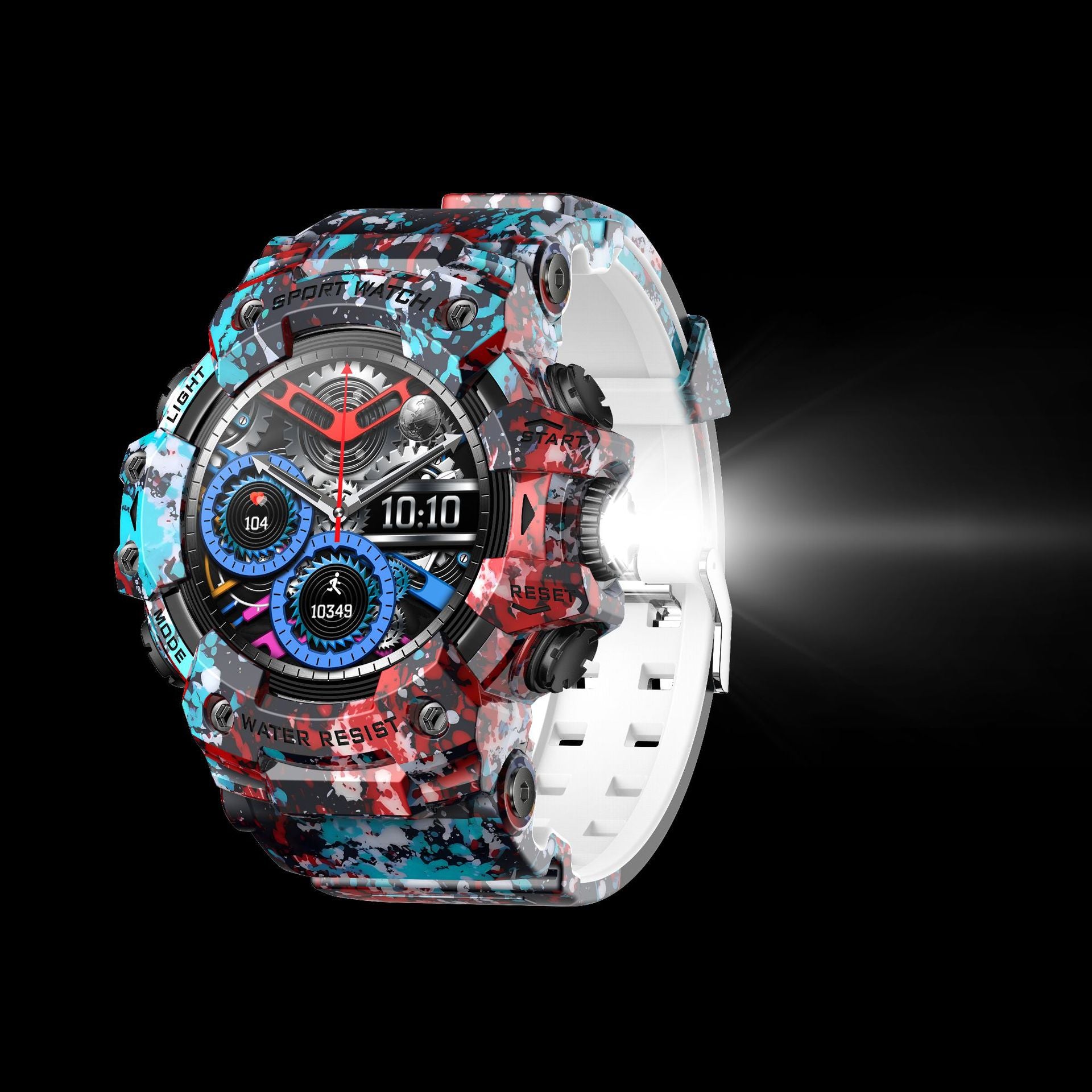 - Rugged & Durable Design: Features an outdoor camouflage strap, multi-function buttons, and a 9H double-layer glass screen for enhanced durability.