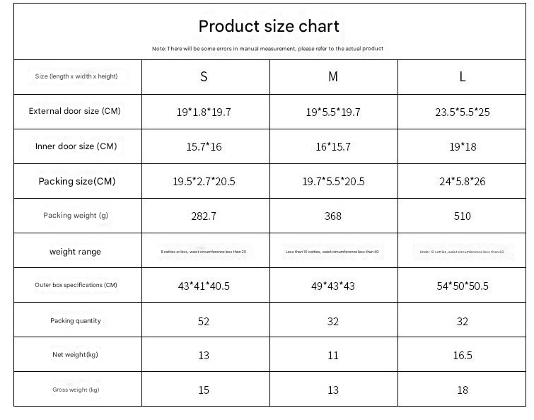 Please measure your pet and the installation area carefully before purchasing. Dimensions are listed as Outer Frame (Width x Height x Depth) and Inner Flap (Width x Height).