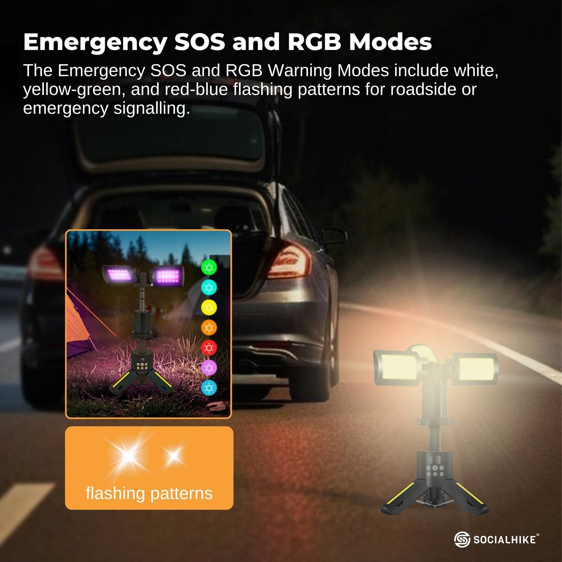 - Emergency SOS and RGB Warning Modes: Includes white, yellow-green, and red-blue flashing patterns for signalling.
