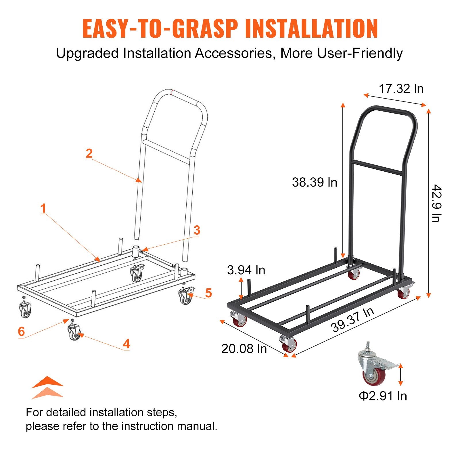 Measuring 39.4 inches in length, 20 inches in width, and 42.9 inches in height, our folding chair dolly has a maximum weight capacity of 110lb. This allows for storage of up to 12 chairs, providing flexibility and space-saving convenience.