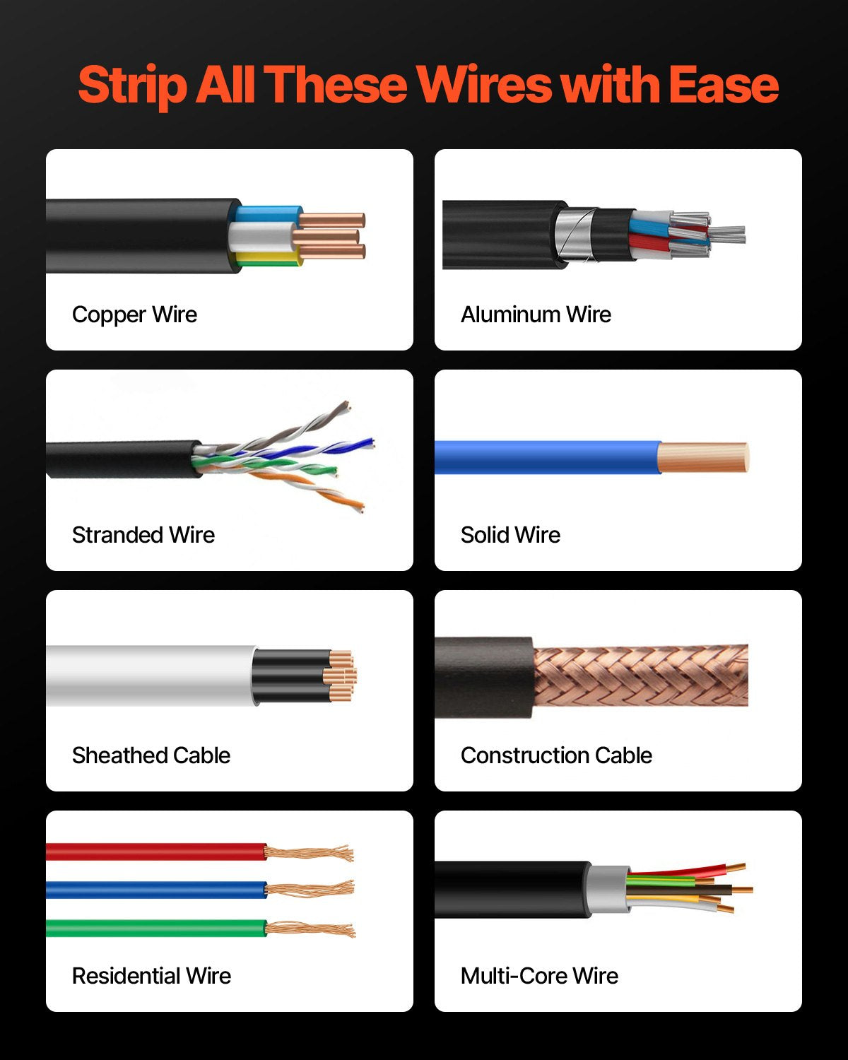 Suitable for stripping hard-cover wire, soft-cover wire, multi-strand cables, single-core wires, and more. Whether you're working in a home, workshop, or industrial environment, it meets all your wire stripping needs