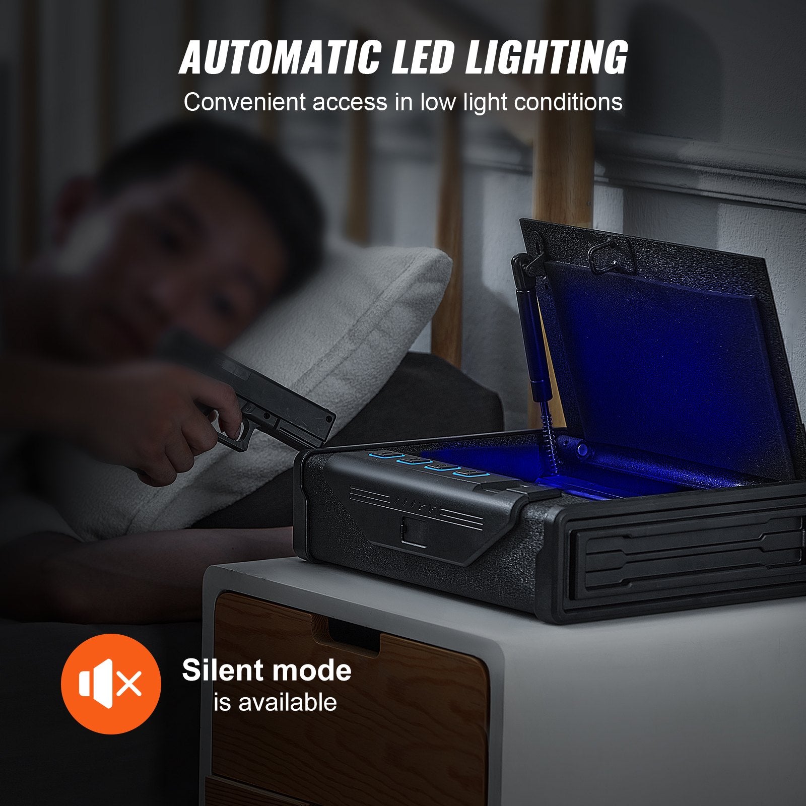 Designed with your needs in mind, our firearm case box includes LED illumination for easy access during nighttime. The silent mode allows you to discreetly retrieve your belongings without disturbing others.