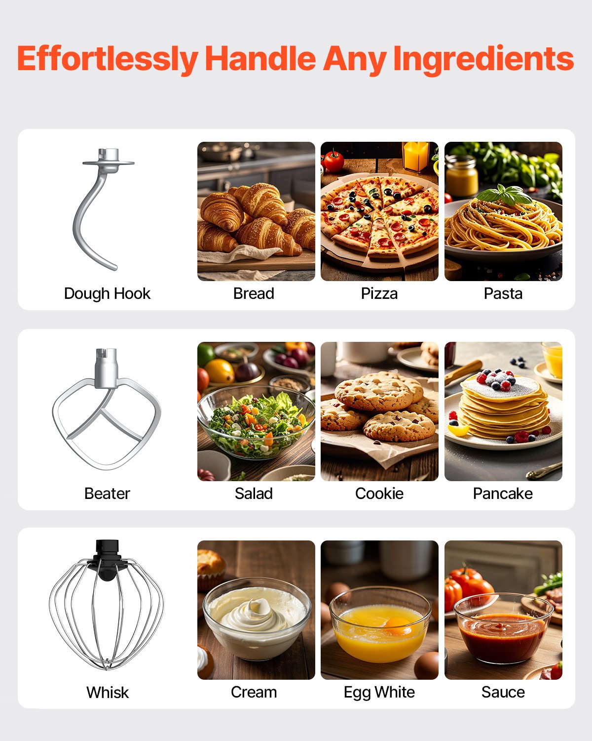 Ready to tackle anything in the kitchen! Our stand mixer features 3 professional mixing attachments: a dough hook for effortlessly kneading pizza or other heavy dough, a flat beater for whipping up mashed potatoes, cake batters, or frosting, and a whisk for creating light mixtures like fluffy whipped cream or egg whites.