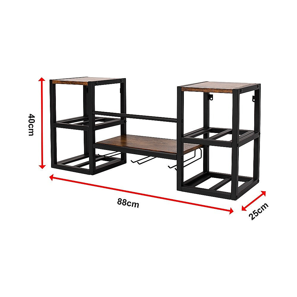 Designed with a vintage industrial flair, this wall-mounted wine rack combines a sturdy matte black iron frame with a rustic brown partial wood shelf. Its charming farmhouse accent adds a touch of elegance to your home, kitchen, dining room, or countertop. It's not only a practical rack but also makes a thoughtful gift for wine lovers.