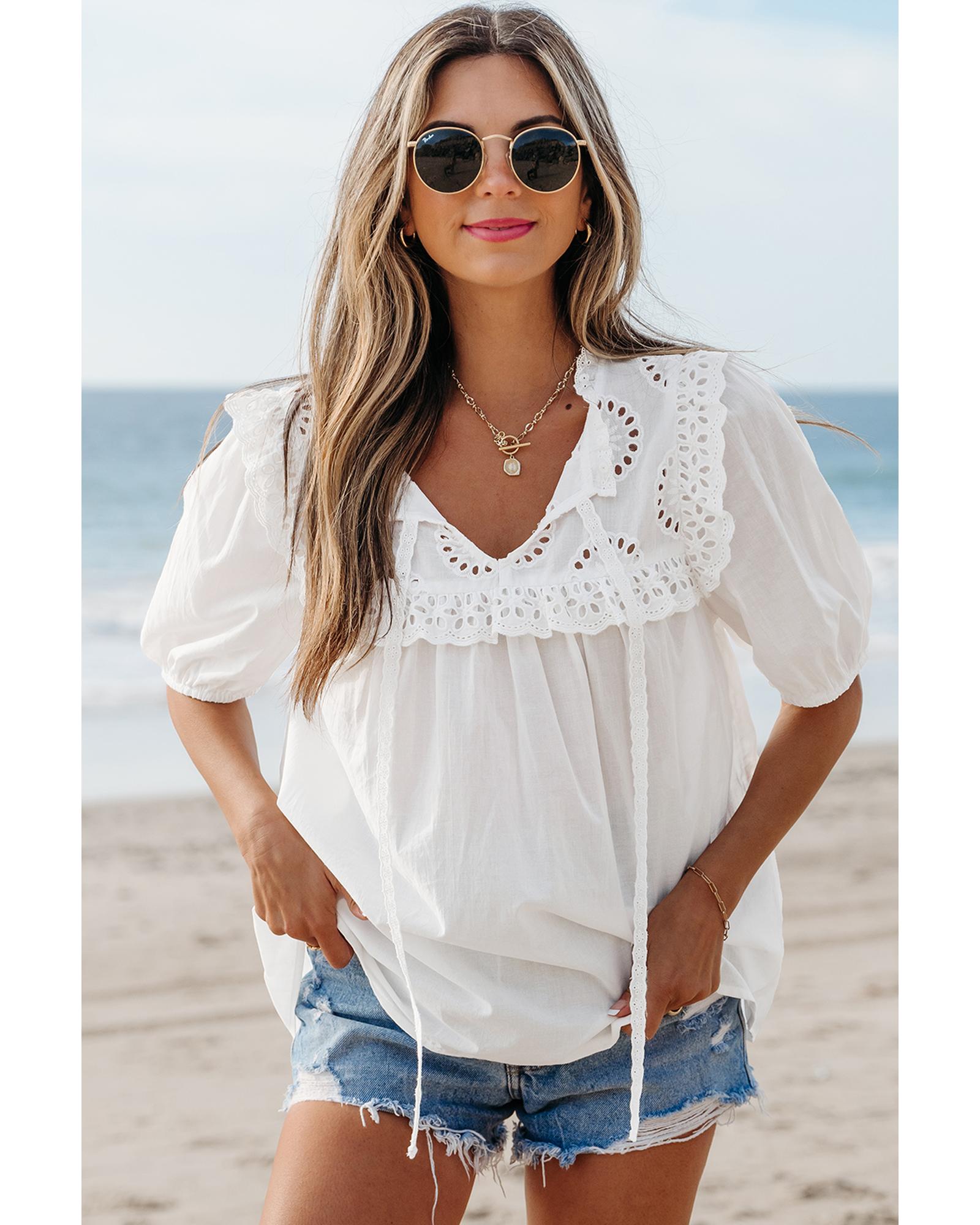 White Embroidered Lace Patchwork Tie Neck Puff Short Sleeve Blouse - M