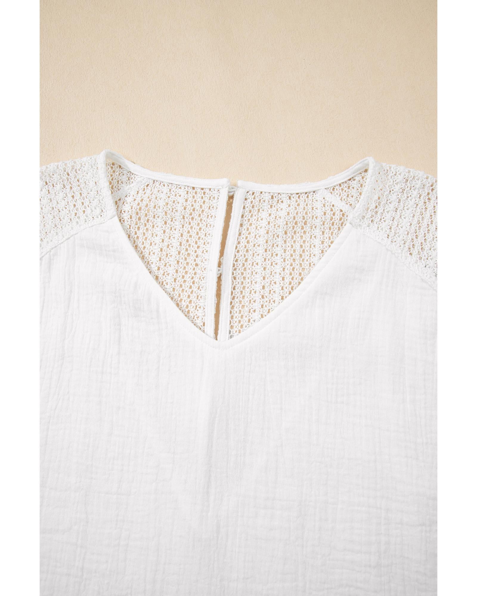 - White Lace Crochet Textured Button Back V Neck T Shirt