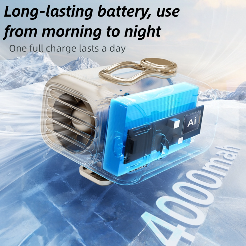 Equipped with a high-capacity rechargeable battery, this fan is ready to go all day, and its multi-way design ensures cooling relief whether you are standing, sitting, or moving.