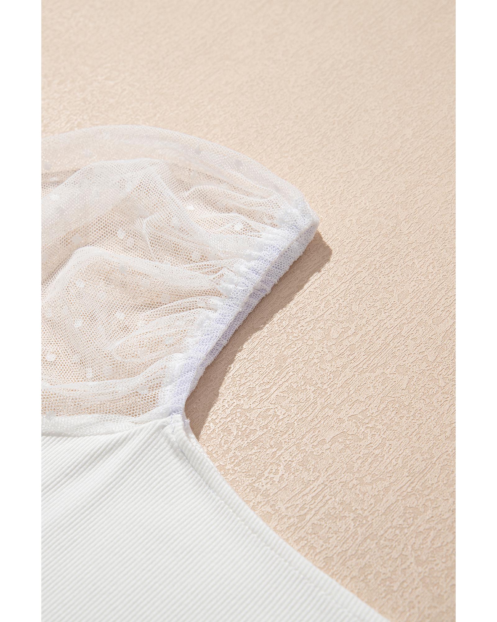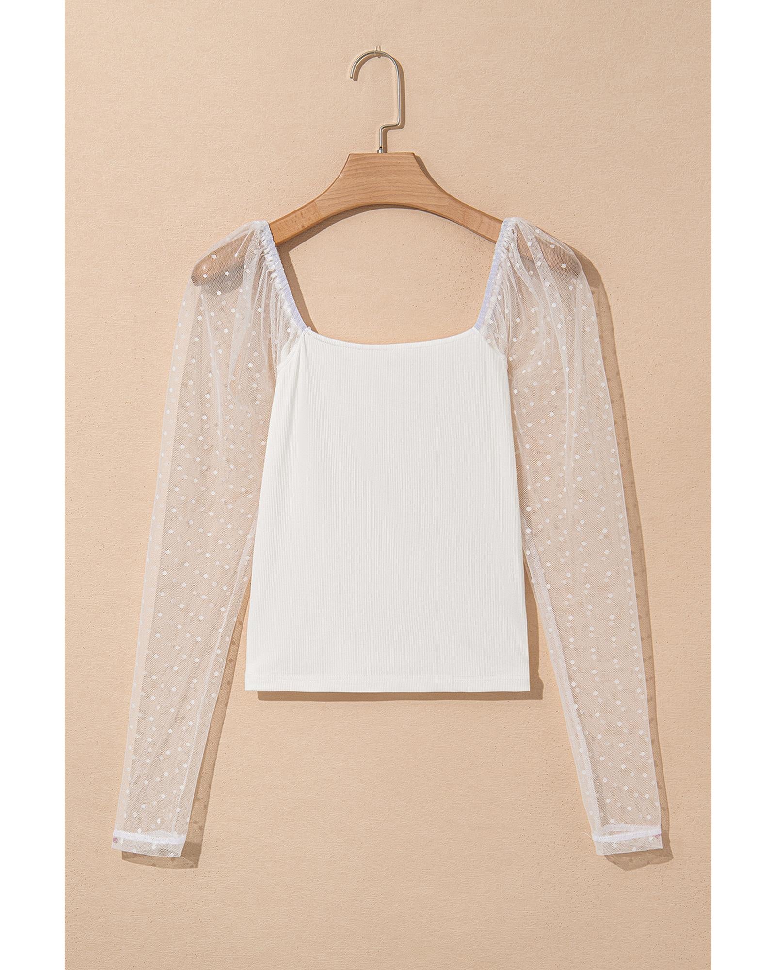 White Swiss Dot Mesh Long Sleeve Square Neck Slim Top - S