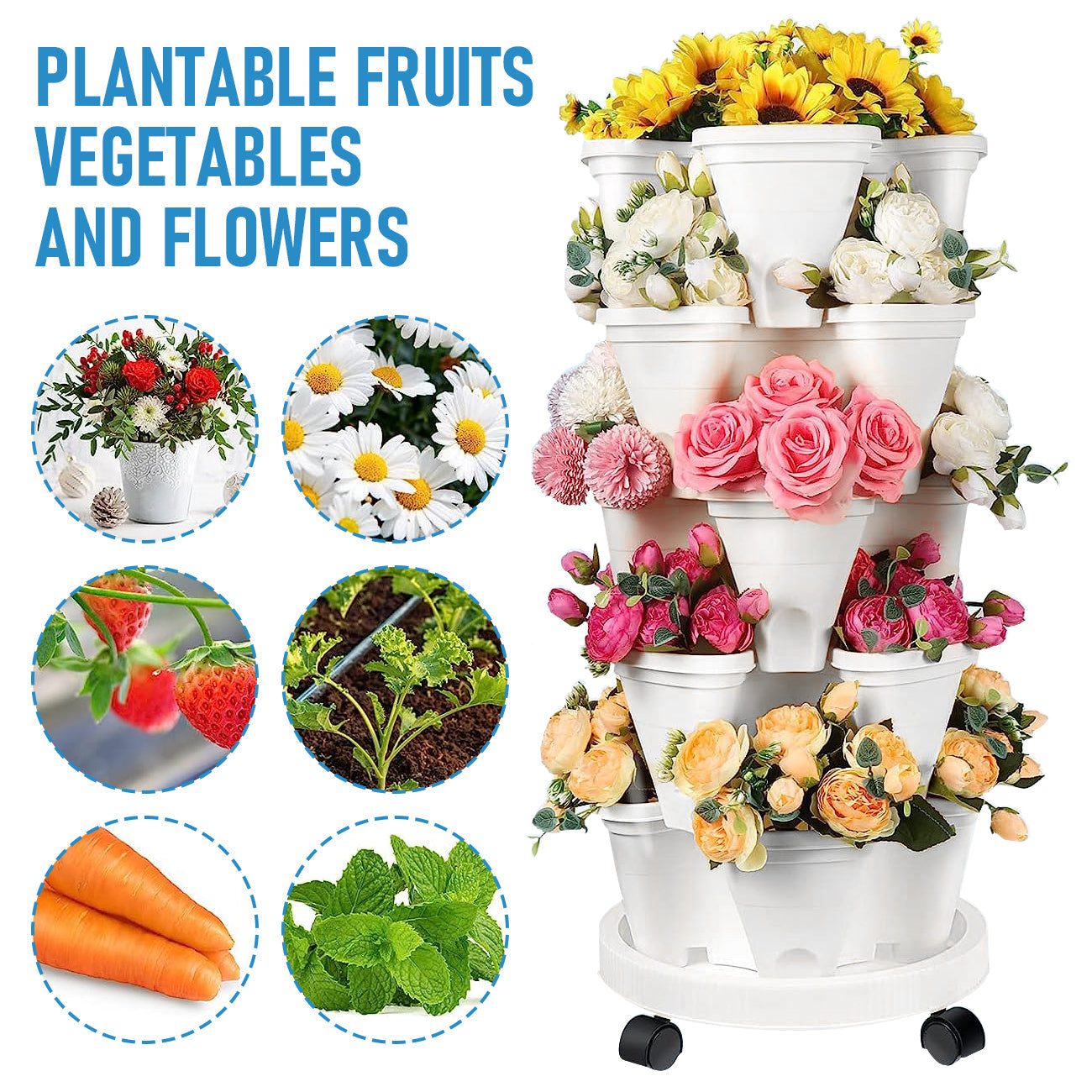 5 Tier Stackable Planter Pots Vertical Garden Stacking Space Saving High Yield Ideal for Herbs Flower Plants Veggies With Wheel White 37cm Width