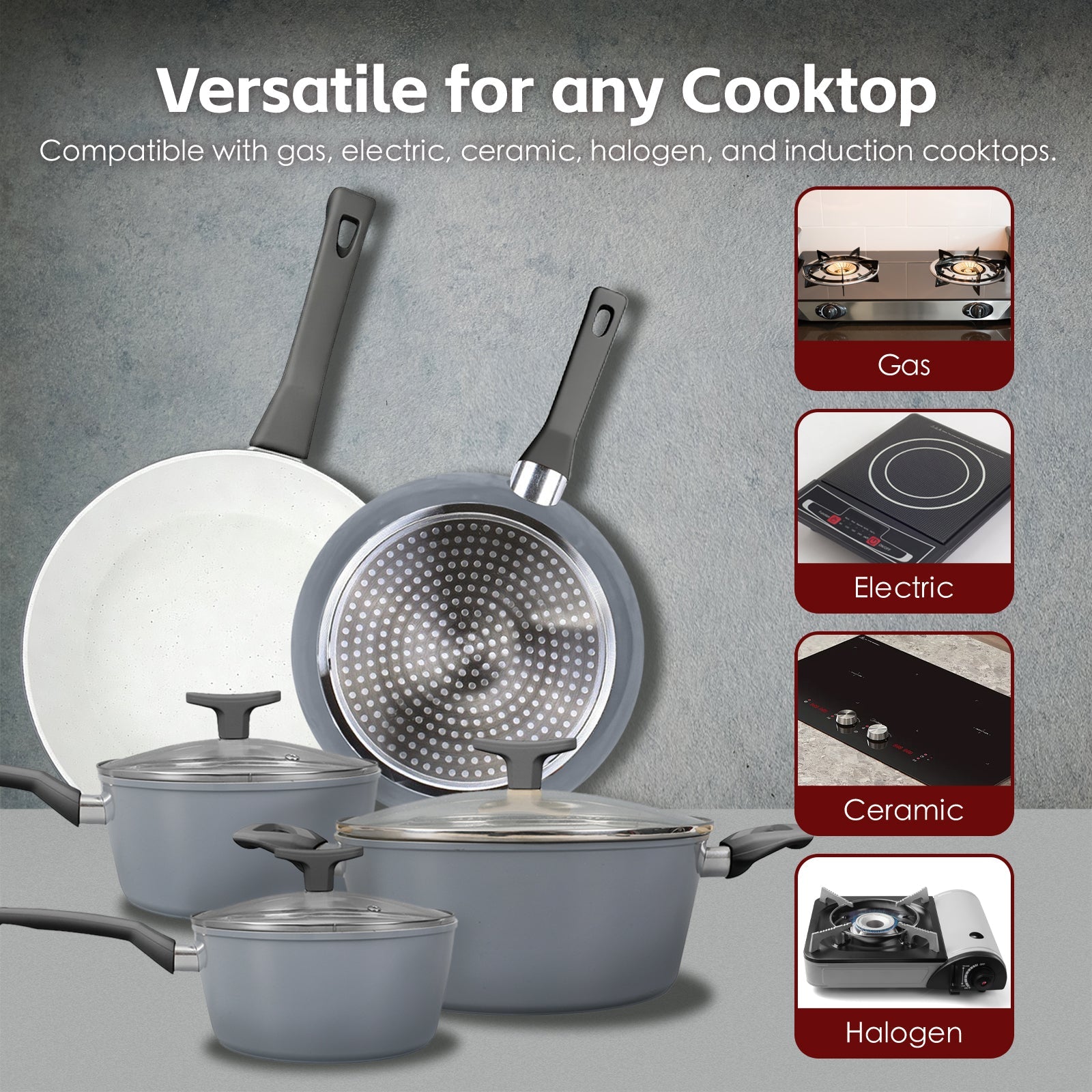 - Suitable for use on electric, gas, ceramic, halogen and induction cooktops