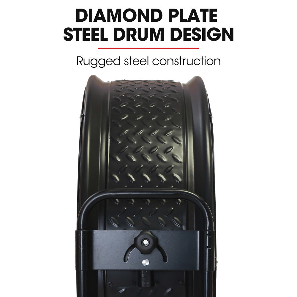 - Heavy-duty all-metal construction with powder-coated steel drum