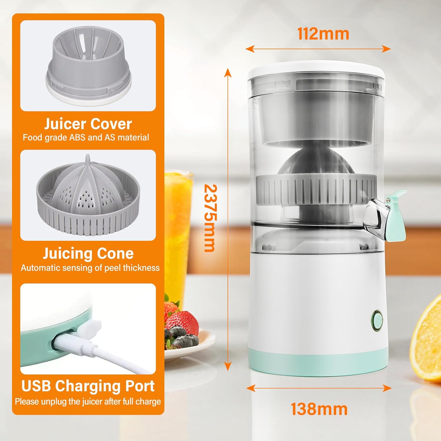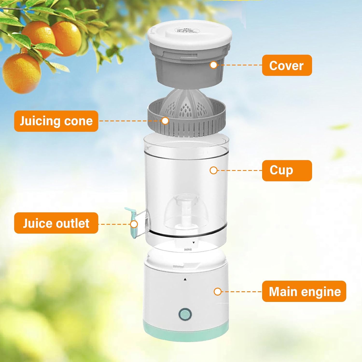 HIGH JUICE YIELD & NO SEEDS: Designed with 360° rotation and automatic peel sensing, the cone extracts up to 90% juice with minimal effort. The anti-drip spout and built-in filter ensure smooth, seed-free juice every time.