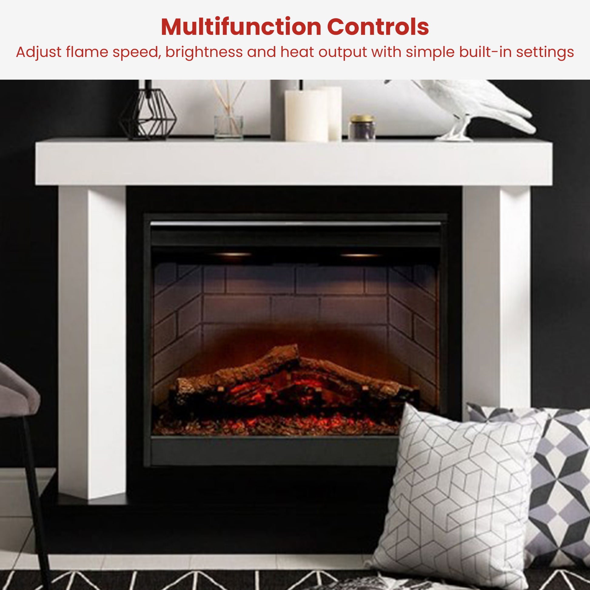 This 26-inch electric firebox showcases lifelike logs, a radiant Optiflame LED display and a classic brick interior that exudes timeless elegance. Equipped with a built-in thermostat, safe cool-touch glass and adjustable controls for flame speed and brightness, it offers comfort without complications. Simply plug it in and unwind, no need for venting or installation. A wonderfully simple way to enjoy warmth and ambience.