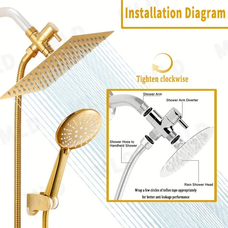 The Golden Rainfall Shower Head and Handheld Set delivers a powerful, high-pressure shower experience with both style and function. Designed with a square rain head and detachable handheld spray, it offers flexibility for daily use. Built with metal construction and a sleek painted finish, itâ€s a durable and practical upgrade for your bathroom.
