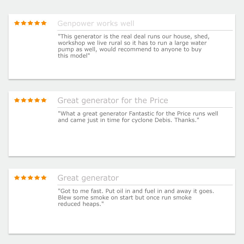 The GenPower diesel generator is perfect for home, farm and Industrial use as a portable power supply or where mains power is temporarily unavailable. Rated continuous operation is 4hrs (100% load) 6 hours (50% load). Please refer to the Service Schedule included in the Manual for more information.