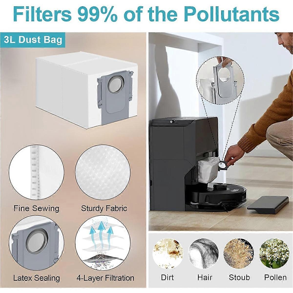 Made of high-quality materials, more durable. The side brush allows your vacuum cleaner to reach deeper into the carpet for a more thorough cleaning. The filter filters fine dust to reduce dust, pollen and other allergens from entering the air you breathe. Uniquely designed brushes with rubber tracks to adapt to different floor surfaces, removing everything from fine dust to large deposits. As part of normal maintenance, it can be easily removed and replaced. It is best to replace spare parts every 2 to 3 months to keep the machine working optimally. Compatible with Roborock S8 Maxv Ultra Color: As shown Material: plastic Package Contents: 1 Pair x Roller Brush 4 x Side Brush 4 x Hepa Filter 4 x Mop Cloth 4 x Dust Bags 2 x Cleaning Brush 1 x Screwdriver 1 x Self-Cleaning Roller Brush Only the above package contents, other products are not included. Note: Light reflection and different displays may cause the color of the item in the picture to be slightly different from the real thing. The measurement allowed error is +/- 1-3 cm._MGF