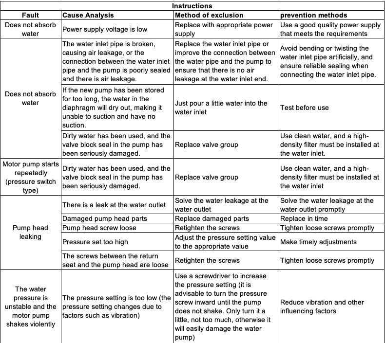 - Thermal Overload and Ignition Protection: The 12 volt water pump has a built-in thermal and overload protection device that automatically stops the pump when the motor is overheated. When the motor surface temperature drops to a tolerable range, it will automatically restart. The waterproof gasket prevents waterfrom entering the motor.
